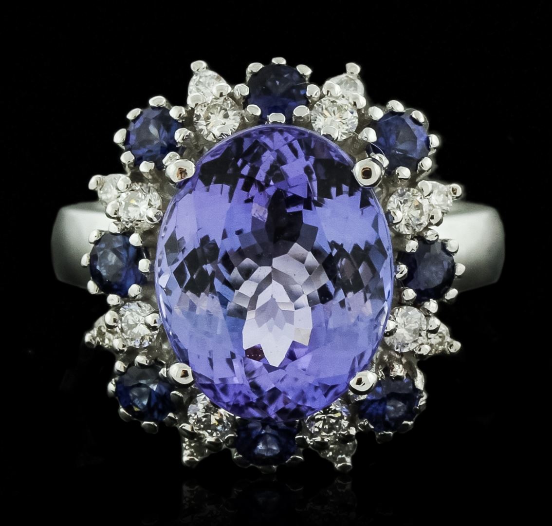 One electronically tested 14KT white gold ladies cast tanzanite, sapphire and diamond ring with a bright polish finish. Identified with markings of "K14". Condition is new. Containing: One prong set oval modified brilliant cut natural tanzanite, measuring 13.00 x 10.50 x 6.83mm, approximate weight of 6.56ct., clarity is eye clean, type I, light, very slightly grayish, violet color, (GIA V 3/3), cut is good. Eight prong set round modified brilliant cut natural blue sapphires, measuring 2.90 - 2.90 x 1.89 mm, approximate total weight of 1.04ct., clarity is eye clean, type II, medium, moderately strong, blue color, (GIA B 5/4), cut is good. Sixteen prong set round brilliant cut diamonds, measuring 1.80 - 1.50 x 0.99mm (depth est.) approximate total weight of 16 Stones = 0.26ct. Clarity: SI-1 to SI-2. Color: H - I, Cut is Good. Colored gemstones are presumed to have been subjected to commonly used enhancement processes. All diamonds and colored gemstones are graded in the mounting, unless otherwise stated. Total Weight of Colored Stones 7.60ct. Total Weight of Diamonds 0.26ct. Total Weight of Ring 8.00 grams. GGL Appraised at $5,725.00.