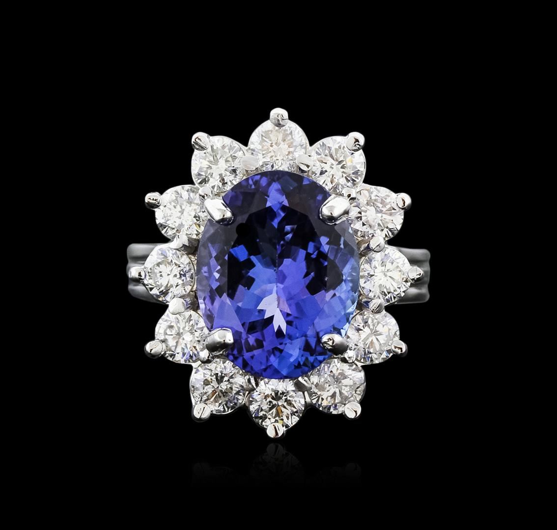 One electronically tested 14KT white gold ladies cast tanzanite and diamond ring with a bright polish finish. Identified with markings of "14K". Condition is new. Containing: One prong set oval modified brilliant cut natural tanzanite, measuring 13.26 x 10.41 x 6.77mm, approximate weight of 6.57ct., clarity is eye clean, type I, medium light, very slightly grayish, bluish violet color, (GIA bV 4/3), cut is good. Twelve prong set round brilliant cut diamonds, measuring 3.50 - 3.50 x 2.10mm (depth est.) approximate total weight of 12 Stones = 1.88ct. Clarity: SI-1 to I-1. Color: I - J, Cut is Good. Colored gemstones are presumed to have been subjected to commonly used enhancement processes. All diamonds and colored gemstones are graded in the mounting, unless otherwise stated. Total Weight of Colored Stones 6.57ct. Total Weight of Diamonds 1.88ct. Total Weight of Ring 8.10 grams. GGL Appraised at $8,260.00.