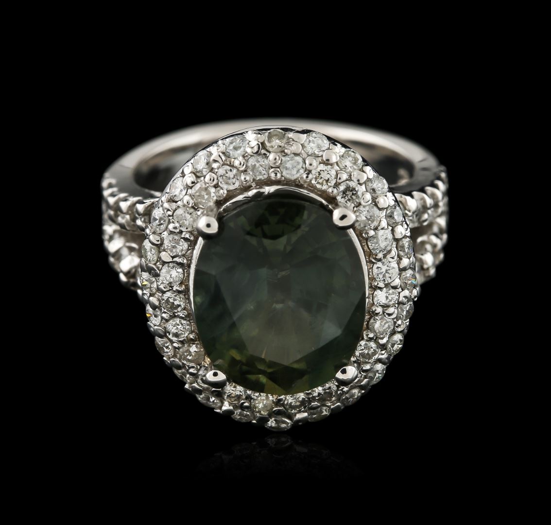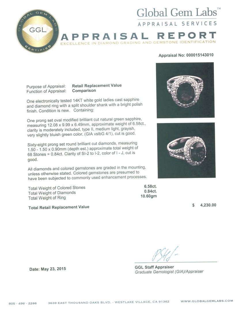 One electronically tested 14KT white gold ladies cast sapphire and diamond ring with a split shoulder shank with a bright polish finish. Condition is new. Containing: One prong set oval modified brilliant cut natural green sapphire, measuring 12.08 x 9.99 x 6.49mm, approximate weight of 6.58ct., clarity is moderately included, type II, medium light, grayish, very slightly bluish green color, (GIA vslbG 4/1), cut is good. Sixty-Eight prong set round brilliant cut diamonds, measuring 1.50 - 1.50 x 0.90mm (depth est.) approximate total weight of 68 Stones = 0.84ct. Clarity: SI-2 to I-2. Color: I - J, Cut is Good. All diamonds and colored gemstones are graded in the mounting, unless otherwise stated. Colored gemstones are presumed to have been subjected to commonly used enhancement processes. Total Weight of Colored Stones 6.58ct. Total Weight of Diamonds 0.84ct. Total Weight of Ring 10.60 grams. GGL Appraised at $4,230.00.