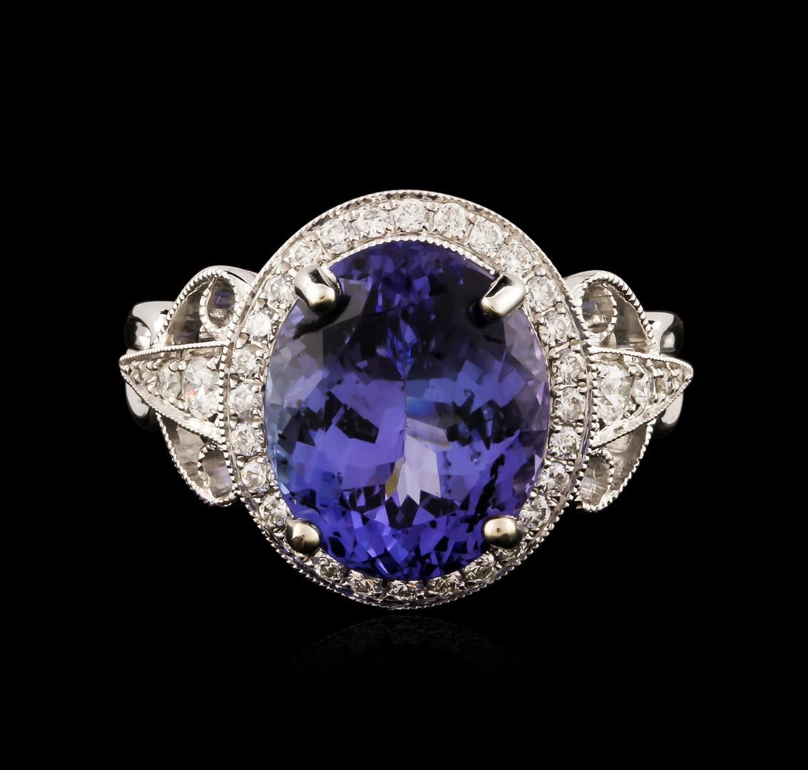 One electronically tested 14KT white gold ladies cast tanzanite and diamond ring with a bright polish finish. Identified with markings of "14K". Condition is new. Containing: One prong set oval modified brilliant cut natural tanzanite, measuring 12.80 x 10.60 x 6.90mm, approximate weight of 6.59ct., clarity is eye clean, type I, medium, moderately strong, violet color, (GIA V 5/4), cut is good. Two prong set round brilliant cut diamonds, measuring 2.40 - 2.40 x 1.44mm (depth est.) approximate total weight of 2 Stones = 0.10ct. Clarity: SI-1 to SI-2. Color: I - J, Cut is Good. Thirty-Six prong set round brilliant cut diamonds, measuring 1.30 - 1.30 x 0.78mm (depth est.) approximate total weight of 36 Stones = 0.29ct. Clarity: SI-1 to SI-2. Color: I - J, Cut is Good. Colored gemstones are presumed to have been subjected to commonly used enhancement processes. All diamonds and colored gemstones are graded in the mounting, unless otherwise stated. Total Weight of Colored Stones 6.59ct. Total Weight of Diamonds 0.39ct. Total Weight of Ring 8.60 grams. GGL Appraised at $6,855.00.