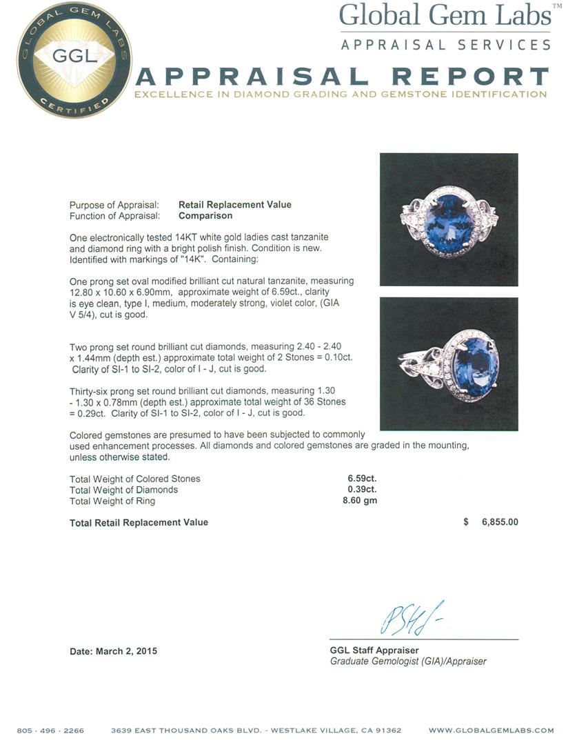 One electronically tested 14KT white gold ladies cast tanzanite and diamond ring with a bright polish finish. Identified with markings of "14K". Condition is new. Containing: One prong set oval modified brilliant cut natural tanzanite, measuring 12.80 x 10.60 x 6.90mm, approximate weight of 6.59ct., clarity is eye clean, type I, medium, moderately strong, violet color, (GIA V 5/4), cut is good. Two prong set round brilliant cut diamonds, measuring 2.40 - 2.40 x 1.44mm (depth est.) approximate total weight of 2 Stones = 0.10 ct. Clarity: SI-1 to SI-2. Color: I - J, Cut is Good. Thirty-Six prong set round brilliant cut diamonds, measuring 1.30 - 1.30 x 0.78mm (depth est.) approximate total weight of 36 Stones = 0.29ct. Clarity: SI-1 to SI-2. Color: I - J, Cut is Good. Colored gemstones are presumed to have been subjected to commonly used enhancement processes. All diamonds and colored gemstones are graded in the mounting, unless otherwise stated. Total Weight of Colored Stones 6.59ct. Total Weight of Diamonds 0.39ct. Total Weight of Ring 8.60 grams. GGL Appraised.