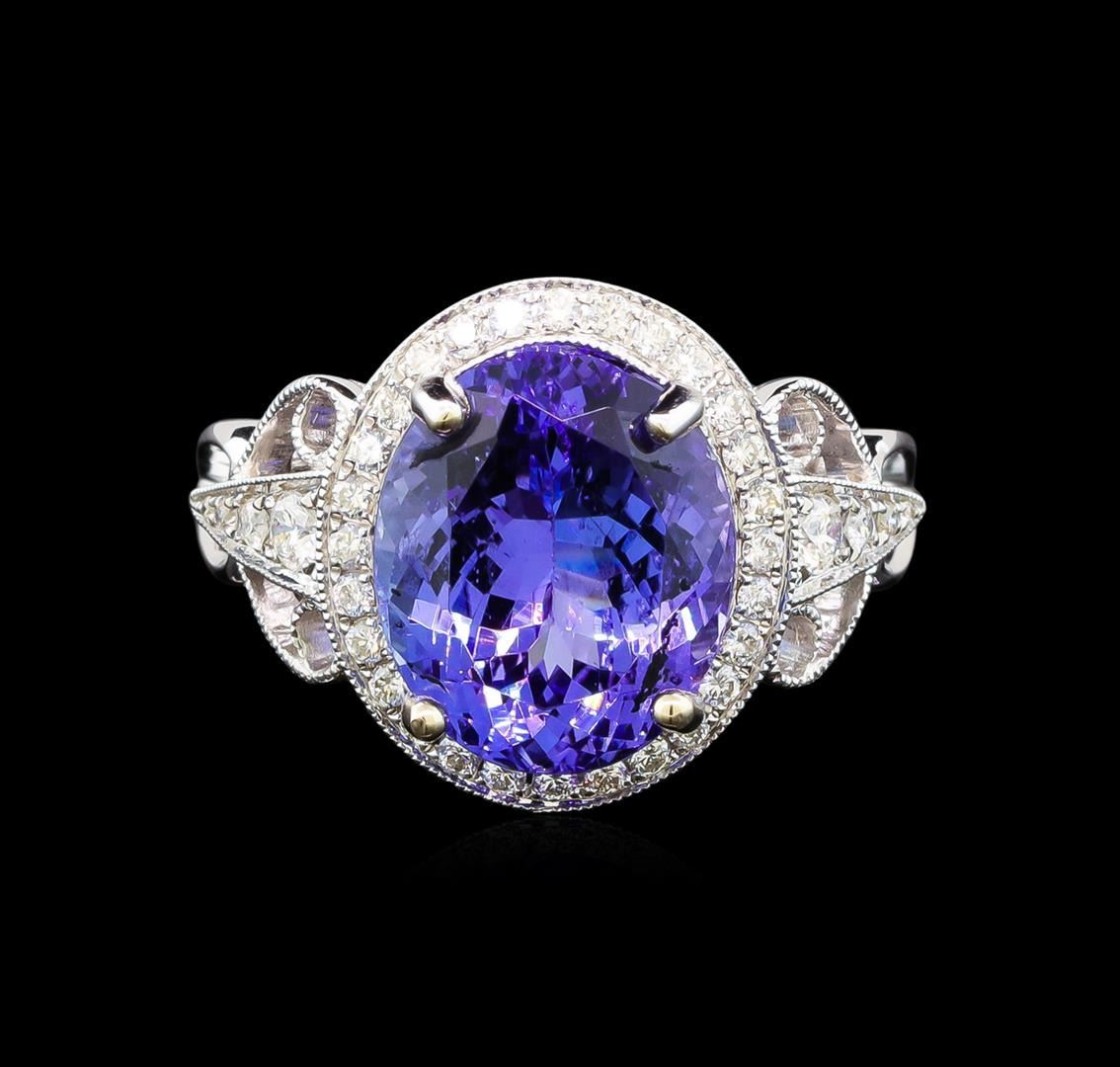 One electronically tested 14KT white gold ladies cast tanzanite and diamond ring with a bright polish finish. Identified with markings of "14K". Condition is new. Containing: One prong set oval modified brilliant cut natural tanzanite, measuring 12.80 x 10.60 x 6.90mm, approximate weight of 6.59ct., clarity is eye clean, type I, medium, moderately strong, violet color, (GIA V 5/4), cut is good. Two prong set round brilliant cut diamonds, measuring 2.40 - 2.40 x 1.44mm (depth est.) approximate total weight of 2 Stones = 0.10 ct. Clarity: SI-1 to SI-2. Color: I - J, Cut is Good. Thirty-Six prong set round brilliant cut diamonds, measuring 1.30 - 1.30 x 0.78mm (depth est.) approximate total weight of 36 Stones = 0.29ct. Clarity: SI-1 to SI-2. Color: I - J, Cut is Good. Colored gemstones are presumed to have been subjected to commonly used enhancement processes. All diamonds and colored gemstones are graded in the mounting, unless otherwise stated. Total Weight of Colored Stones 6.59ct. Total Weight of Diamonds 0.39ct. Total Weight of Ring 8.60 grams. GGL Appraised.