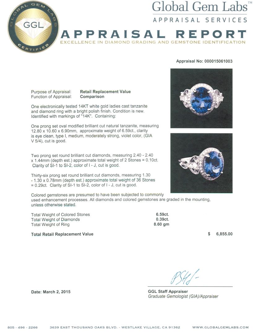 One electronically tested 14KT white gold ladies cast tanzanite and diamond ring with a bright polish finish. Identified with markings of "14K". Condition is new. Containing: One prong set oval modified brilliant cut natural tanzanite, measuring 12.80 x 10.60 x 6.90mm, approximate weight of 6.59ct., clarity is eye clean, type I, medium, moderately strong, violet color, (GIA V 5/4), cut is good. Two prong set round brilliant cut diamonds, measuring 2.40 - 2.40 x 1.44mm (depth est.) approximate total weight of 2 Stones = 0.10ct. Clarity: SI-1 to SI-2. Color: I - J, Cut is Good. Thirty-Six prong set round brilliant cut diamonds, measuring 1.30 - 1.30 x 0.78mm (depth est.) approximate total weight of 36 Stones = 0.29ct. Clarity: SI-1 to SI-2. Color: I - J, Cut is Good. Colored gemstones are presumed to have been subjected to commonly used enhancement processes. All diamonds and colored gemstones are graded in the mounting, unless otherwise stated. Total Weight of Colored Stones 6.59ct. Total Weight of Diamonds 0.39ct. Total Weight of Ring 8.60 grams. GGL Appraised at $6,855.00.