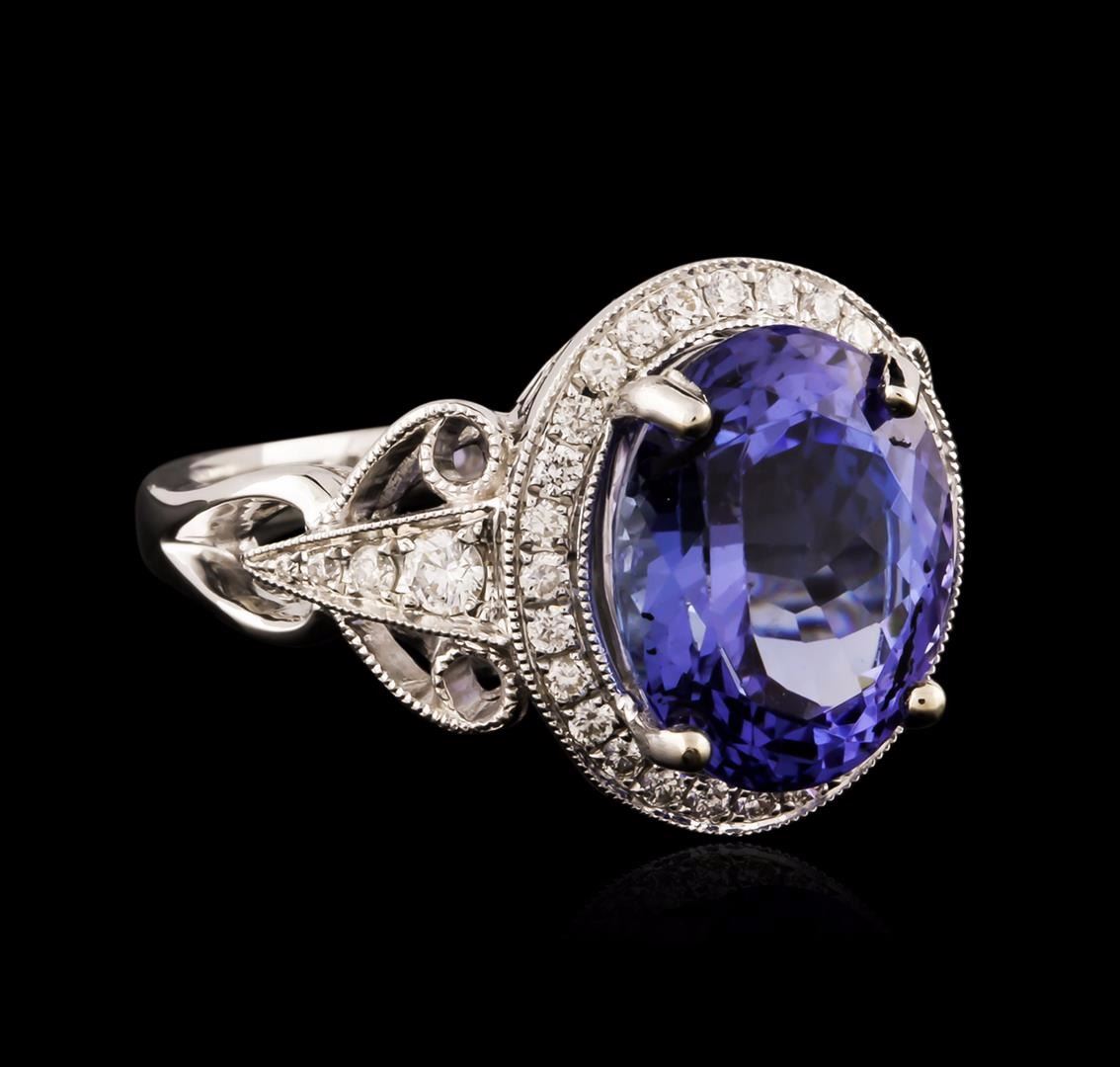 One electronically tested 14KT white gold ladies cast tanzanite and diamond ring with a bright polish finish. Identified with markings of "14K". Condition is new. Containing: One prong set oval modified brilliant cut natural tanzanite, measuring 12.80 x 10.60 x 6.90mm, approximate weight of 6.59ct., clarity is eye clean, type I, medium, moderately strong, violet color, (GIA V 5/4), cut is good. Two prong set round brilliant cut diamonds, measuring 2.40 - 2.40 x 1.44mm (depth est.) approximate total weight of 2 Stones = 0.10ct. Clarity: SI-1 to SI-2. Color: I - J, Cut is Good. Thirty-Six prong set round brilliant cut diamonds, measuring 1.30 - 1.30 x 0.78mm (depth est.) approximate total weight of 36 Stones = 0.29ct. Clarity: SI-1 to SI-2. Color: I - J, Cut is Good. Colored gemstones are presumed to have been subjected to commonly used enhancement processes. All diamonds and colored gemstones are graded in the mounting, unless otherwise stated. Total Weight of Colored Stones 6.59ct. Total Weight of Diamonds 0.39ct. Total Weight of Ring 8.60 grams. GGL Appraised at $6,855.00.