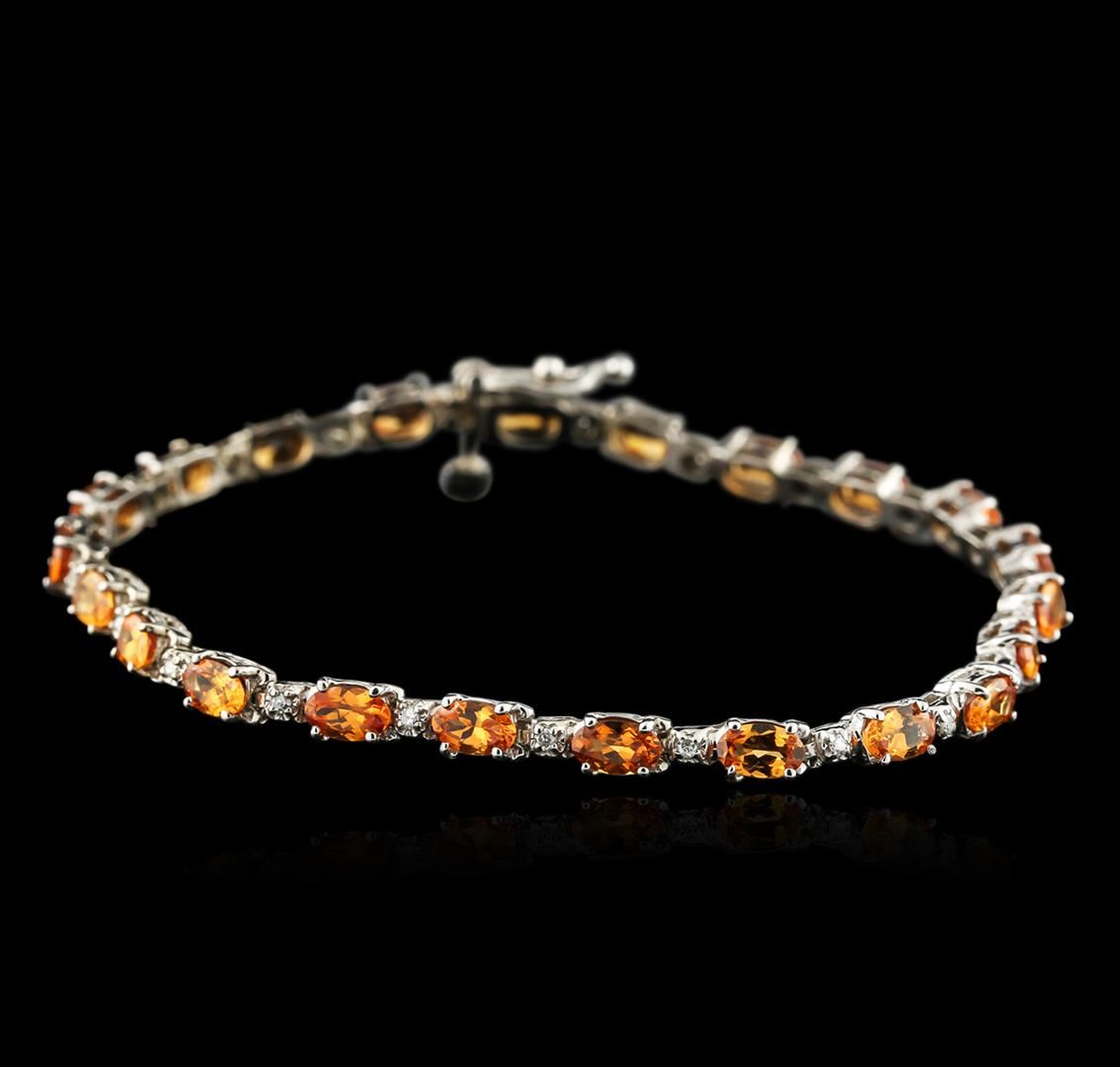 One electronically tested 14KT white gold ladies combination cast & assembled garnet and diamond bracelet with a hidden box clasp with safety closer with a bright polish finish. Identified with markings of "14K". Condition is new. Containing: Twenty-two prong set oval modified brilliant cut natural mandarin spessartites, measuring 5.20 x 3.20 x 2.08mm, approximate total weight of 6.60ct., clarity is slightly included, type II, medium light, slightly brownish, orange color, (GIA O 4/2), cut is good. Twenty-Two prong set round brilliant cut diamonds, measuring 1.30 - 1.30 x 0.78mm (depth est.) approximate total weight of 22 Stones = 0.18ct. Clarity: SI-2 to I-1. Color: I - J, Cut is Good. Colored gemstones are presumed to have been subjected to commonly used enhancement processes. Diamonds and colored gemstones are graded in the mounting, unless otherwise stated. Total Weight of Colored Stones 6.60ct. Total Weight of Diamonds 0.18ct. Total Weight of Bracelet 8.50 grams. GGL Appraised at $3,710.00.