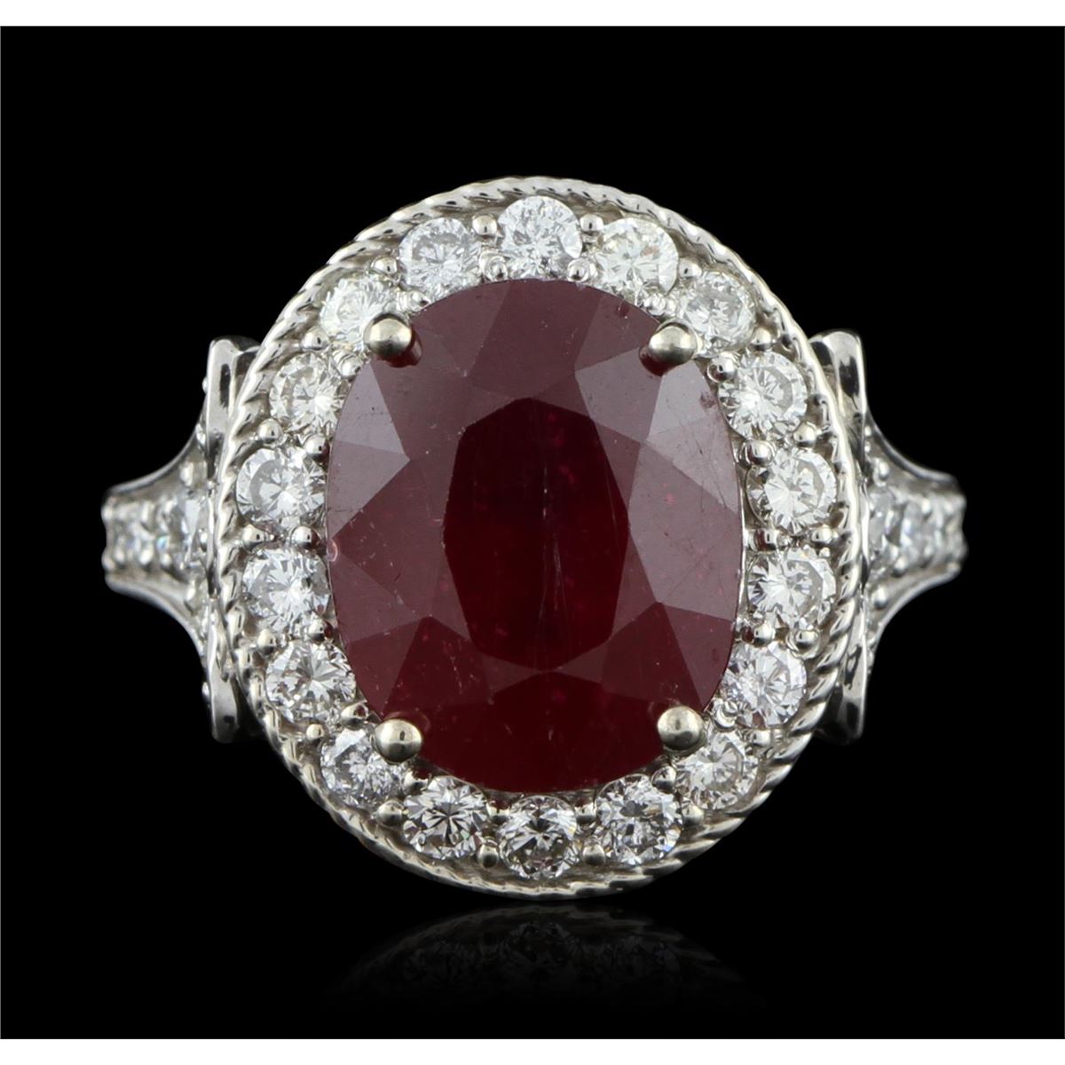 One electronically tested 14KT white gold ladies cast ruby and diamond ring with a bright polish finish. Condition is new, good workmanship. The featured ruby is set within a diamond bezel, supported by diamond set shoulders and completed by a two millimeter wide band. Identified with markings of "14K". Containing: One prong set oval mixed cut natural ruby, measuring 12.15 x 9.90 x 6.25mm, 8% bulge factor, approximate weight of 6.61ct., clarity is heavily included, type II, medium dark, moderately strong, slightly purplish red color, (GIA slpR 6/4), cut is good. Transmitting light somewhat diffusely, transparent to translucent. Naturally occurring internal & external characteristics are present. Indications of laboratory high temperature heat treatment, with glass & flux additives. Colored Stone Grading Report attached. Graded in the setting. Ruby has a low tolerance to rhodium plating, repolishing the surface, & ultrasonic cleaning. Thirty-six bead set round brilliant cut diamonds, measuring 2.50 - 1.30 x 1.14mm (depth est.) approximate total weight of 36 Stones = 1.17ct. Graded in the setting. Clarity VS-2 to SI-2. Color G - I. Total Weight of Colored Stones 6.61ct. Total Weight of Diamonds 1.17ct. Total Weight of Ring 8.00gm. AIG Appraised at $7,070.00.