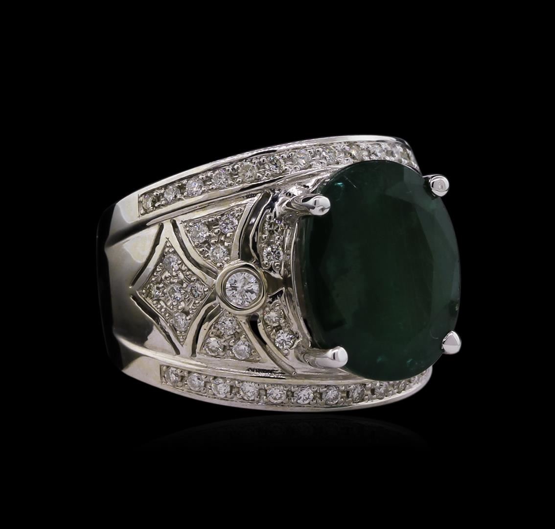 One electronically tested 14KT white gold Ladies combination cast & assembled ring with a bright polish finish. Condition is new. Identified with markings of "14K". Containing: One prong set oval modified brilliant cut natural emerald, measuring 14.00 x 11.00 x 7.80mm, approximate weight of 6.63ct., clarity is heavily included, type III, dark, moderately strong, green color, (GIA G 7/4), cut is good. Colored gemstones are presumed to have been subjected to commonly used and possible undetectable color/clarity enhancement processes. Two prong set round brilliant cut diamonds, measuring 2.20 - 2.20 x 1.32mm (depth est.) approximate total weight of 2 Stones = 0.08ct. Clarity of SI-2 to I-1, Color of G - H, Cut is Very Good. Sixty prong set round brilliant cut diamonds, measuring 1.00 - 1.00 x 0.60mm (depth est.) approximate total weight of 60 Stones = 0.22ct. Clarity of SI-1 to SI-2, Color of G - H, Cut is Very Good. Total Weight of Colored Stones 6.63ct. Total Weight of Diamonds 0.29ct. Total Weight of Ring 10.60gm. GGL Appraised at $14,610.00.