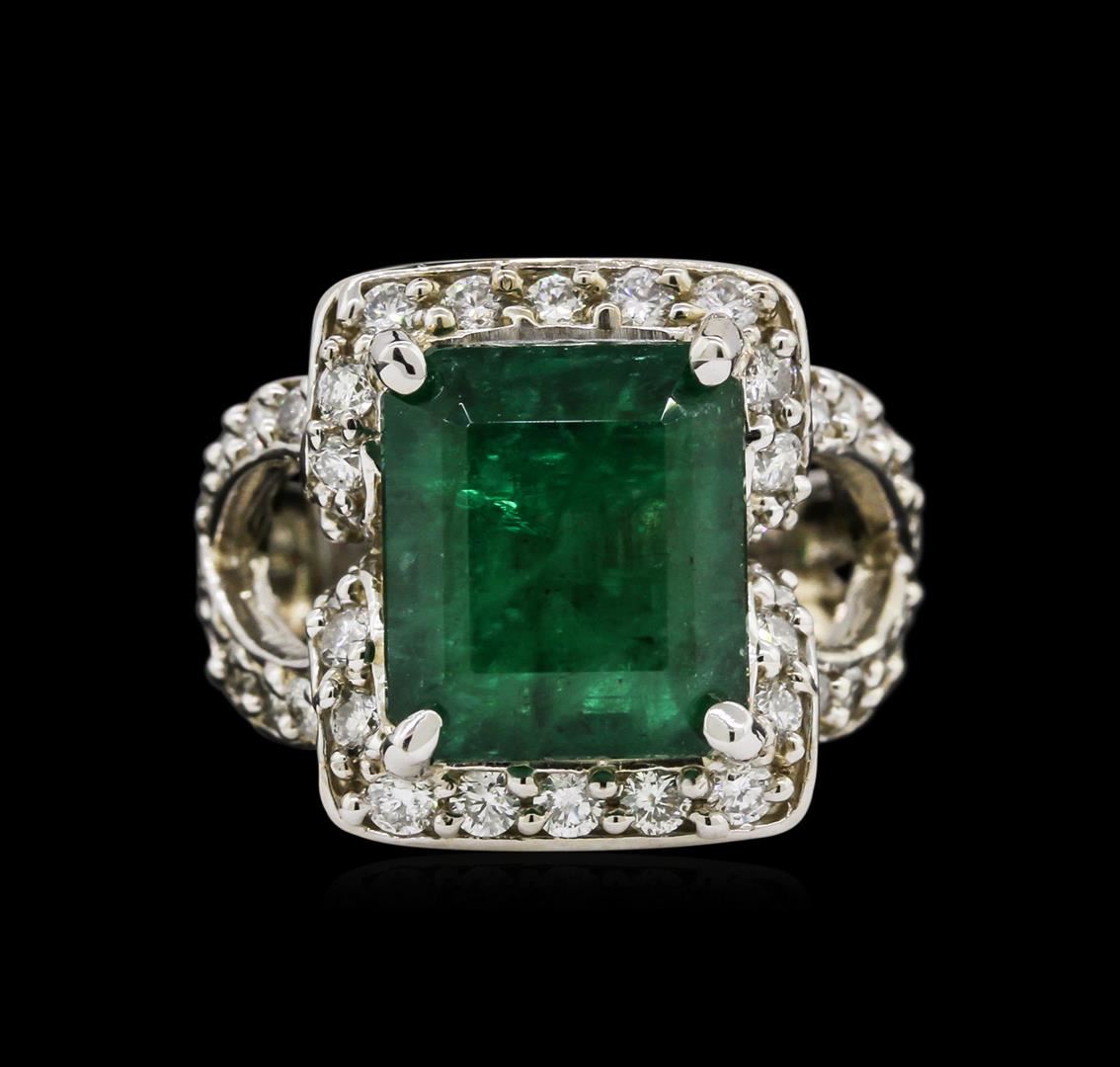 One polished, stamped, and electronically tested solid 14KT white gold ring featuring: 1 genuine emerald center stone with a total weight of 6.63ct and 46 genuine round full cut diamonds with a total weight of 2.05cts. This item weighs 12.5 grams, condition is new, very good workmanship. AIGL Appraised at $9,780.00.
