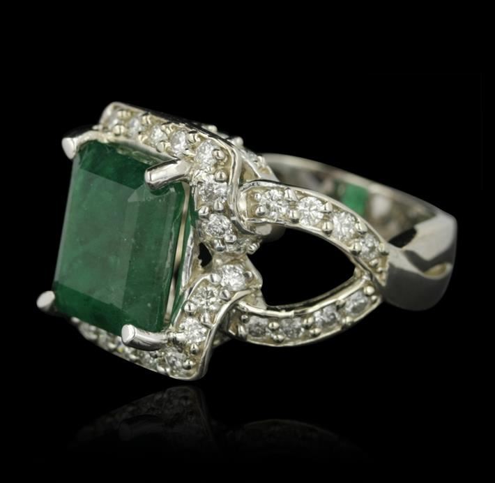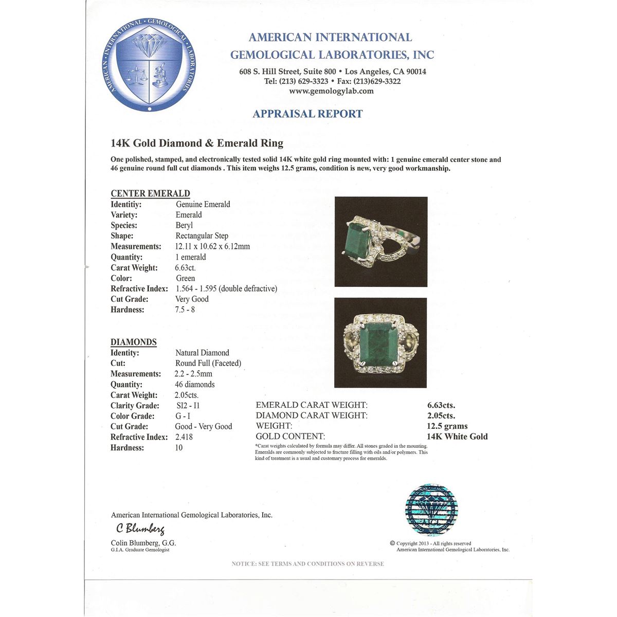 One polished, stamped, and electronically tested solid 14KT white gold ring featuring: 1 genuine emerald center stone with a total weight of 6.63ct and 46 genuine round full cut diamonds with a total weight of 2.05cts. This item weighs 12.5 grams, condition is new, very good workmanship. AIGL Appraised at $9,780.00.