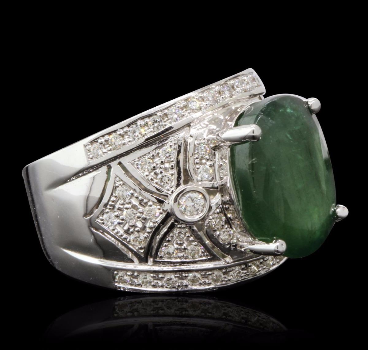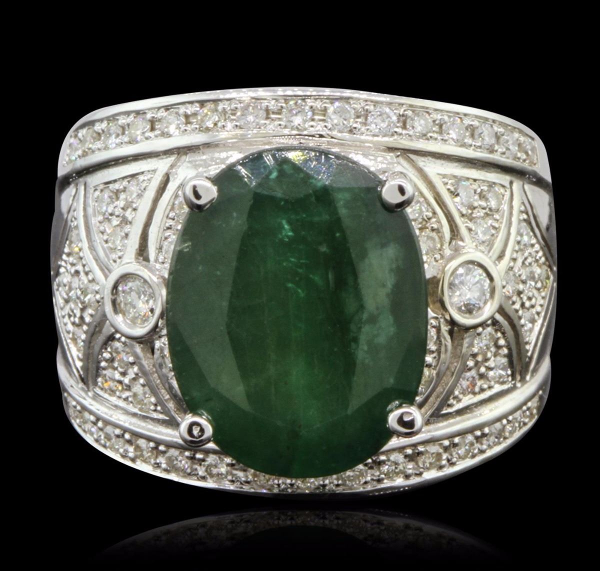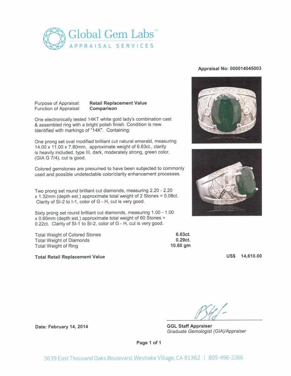 One electronically tested 14KT white gold Ladies combination cast & assembled ring with a bright polish finish. Condition is new. Identified with markings of "14K". Containing: One prong set oval modified brilliant cut natural emerald, measuring 14.00 x 11.00 x 7.80mm, approximate weight of 6.63ct., clarity is heavily included, type III, dark, moderately strong, green color, (GIA G 7/4), cut is good. Colored gemstones are presumed to have been subjected to commonly used and possible undetectable color/clarity enhancement processes. Two prong set round brilliant cut diamonds, measuring 2.20 - 2.20 x 1.32mm (depth est.) approximate total weight of 2 Stones = 0.08ct. Clarity of SI-2 to I-1, Color of G - H, Cut is Very Good. Sixty prong set round brilliant cut diamonds, measuring 1.00 - 1.00 x 0.60mm (depth est.) approximate total weight of 60 Stones = 0.22ct. Clarity of SI-1 to SI-2, Color of G - H, Cut is Very Good. Total Weight of Colored Stones 6.63ct. Total Weight of Diamonds 0.29ct. Total Weight of Ring 10.60gm. GGL Appraised at $14,610.00.