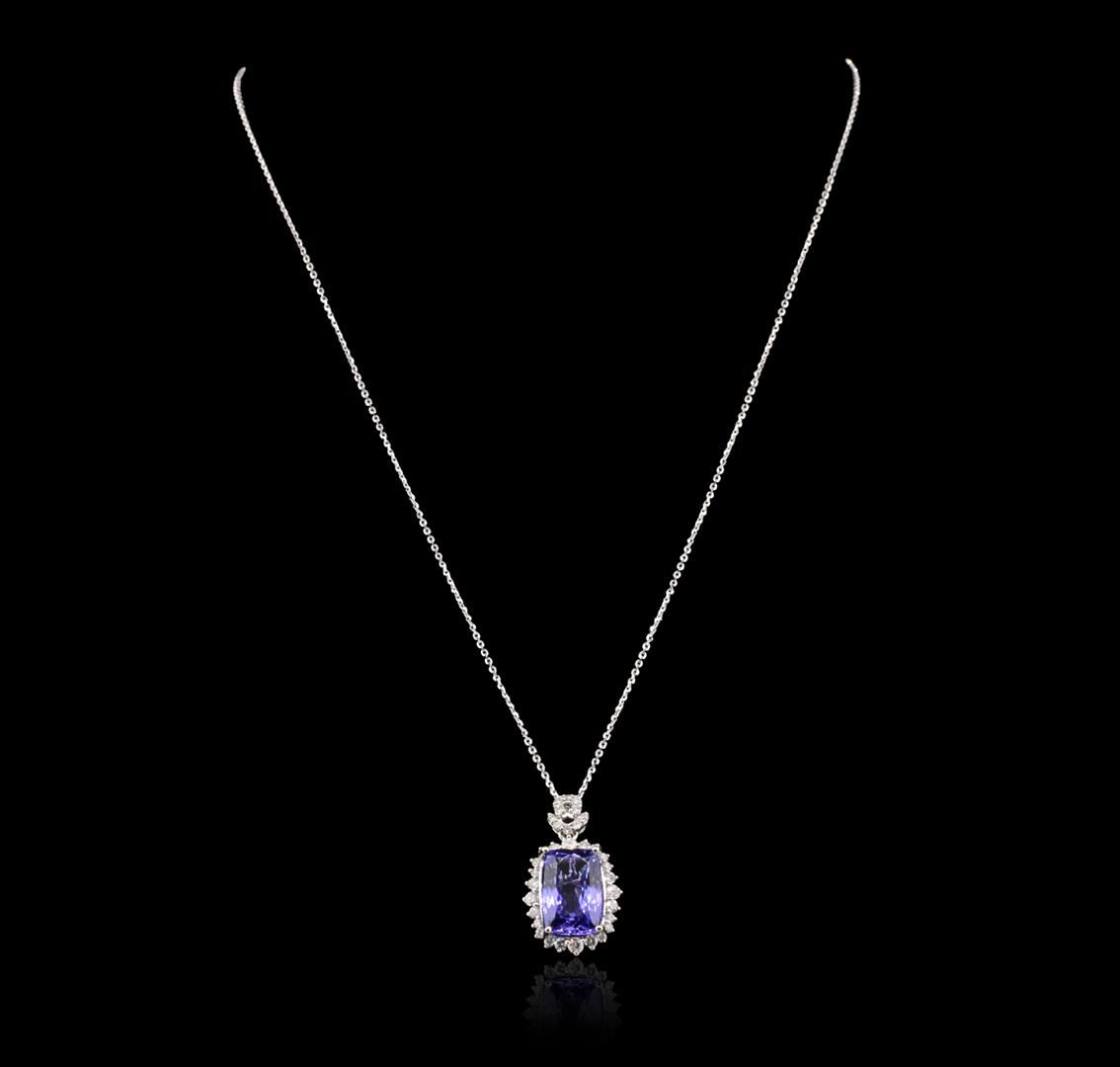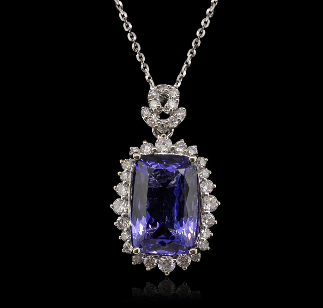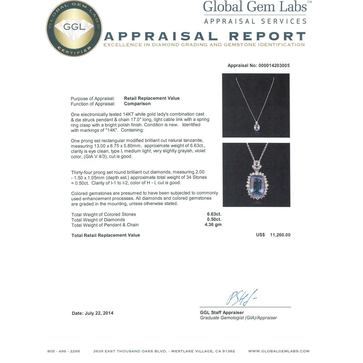 One electronically tested 14KT white gold ladies combination cast & die struck pendant & chain 17.0" long, light cable link with a spring ring clasp with a bright polish finish. Condition is new. Identified with markings of "14K". Containing: One prong set rectangular modified brilliant cut natural tanzanite, measuring 13.00 x 8.75 x 5.80mm, approximate weight of 6.63ct., clarity is eye clean, type I, medium light, very slightly grayish, violet color, (GIA V 4/3), cut is good. Thirty-Four prong set round brilliant cut diamonds, measuring 2.00 - 1.50 x 1.05mm (depth est.) approximate total weight of 34 Stones = 0.50ct. Clarity: I-1 to I-2. Color: H - I, Cut is Good. Colored gemstones are presumed to have been subjected to commonly used enhancement processes. All diamonds and colored gemstones are graded in the mounting, unless otherwise stated. Total Weight of Colored Stones 6.63ct. Total Weight of Diamonds 0.50ct. Total Weight of Pendant & Chain 4.36 grams. GGL Appraised at $11,260.00.