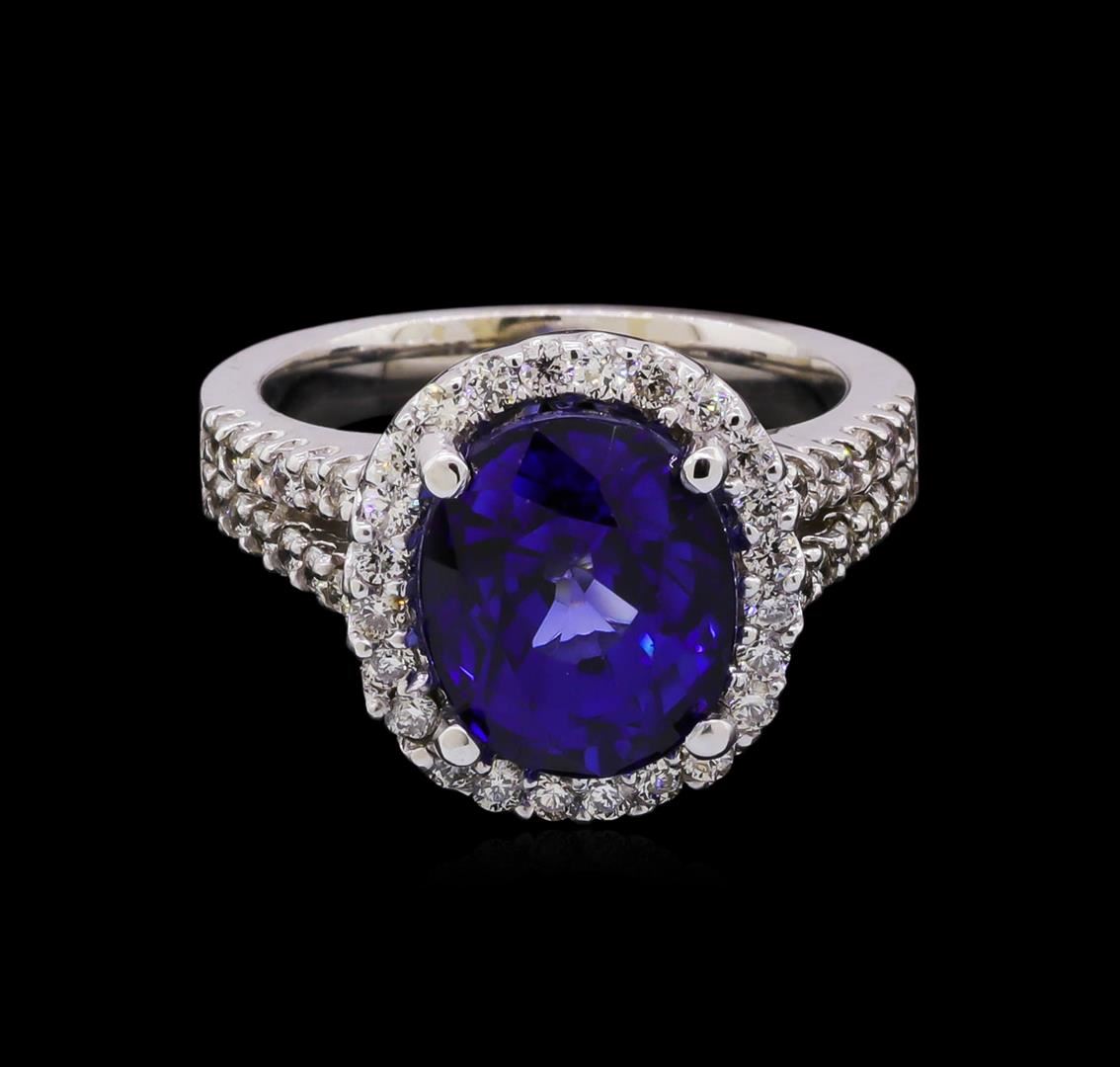 One electronically tested 14KT white gold Ladies combination cast & assembled fancy ring with a bright polish finish. Identified with markings of "14K". Condition is excellent. Containing: One prong set oval modified brilliant cut natural blue sapphire, measuring 11.10 x 9.10 x 6.50mm, approximate weight of 6.64ct., clarity is eye clean, type II, cut is very good. Colored gemstones are presumed to have been subjected to commonly used and possible undetectable color/clarity enhancement processes. Forty-Eight prong set round brilliant cut diamonds, measuring 1.60 x 0.96mm (depth est.) approximate total weight of 48 Stones = 0.78ct. Clarity of SI-1 to SI-2, Color of J - K, Cut is Good. Total Weight of Colored Stones 6.64ct. Total Weight of Diamonds 0.78ct. Total Weight of Ring 8.90gm. GGL Appraised at $17,645.00.