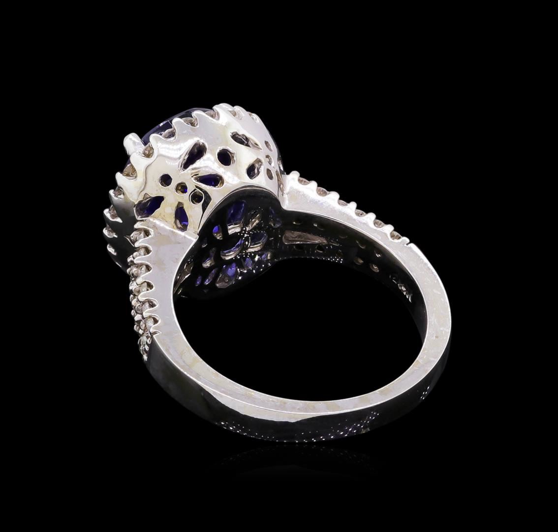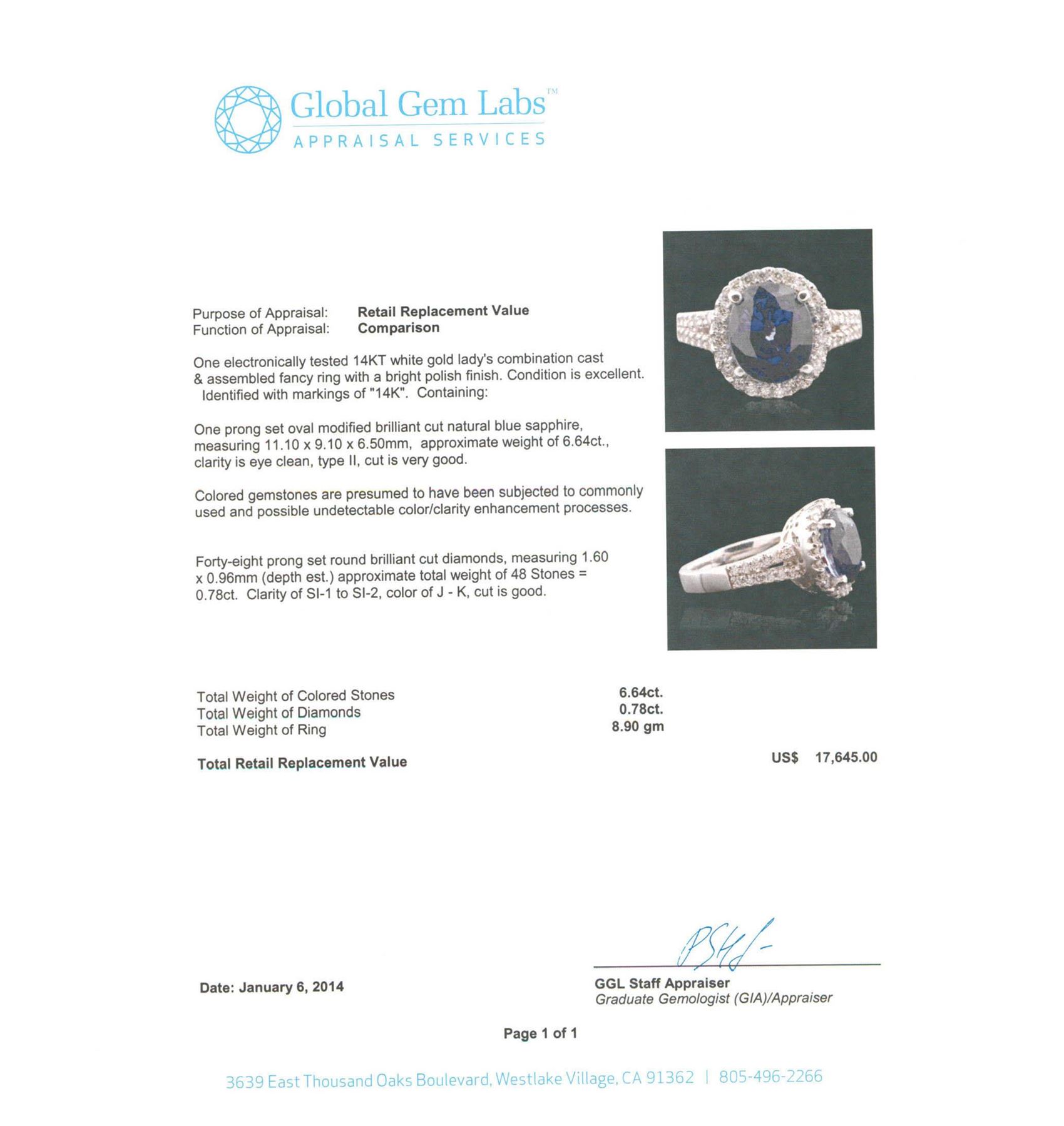 One electronically tested 14KT white gold Ladies combination cast & assembled fancy ring with a bright polish finish. Identified with markings of "14K". Condition is excellent. Containing: One prong set oval modified brilliant cut natural blue sapphire, measuring 11.10 x 9.10 x 6.50mm, approximate weight of 6.64ct., clarity is eye clean, type II, cut is very good. Colored gemstones are presumed to have been subjected to commonly used and possible undetectable color/clarity enhancement processes. Forty-Eight prong set round brilliant cut diamonds, measuring 1.60 x 0.96mm (depth est.) approximate total weight of 48 Stones = 0.78ct. Clarity of SI-1 to SI-2, Color of J - K, Cut is Good. Total Weight of Colored Stones 6.64ct. Total Weight of Diamonds 0.78ct. Total Weight of Ring 8.90gm. GGL Appraised at $17,645.00.