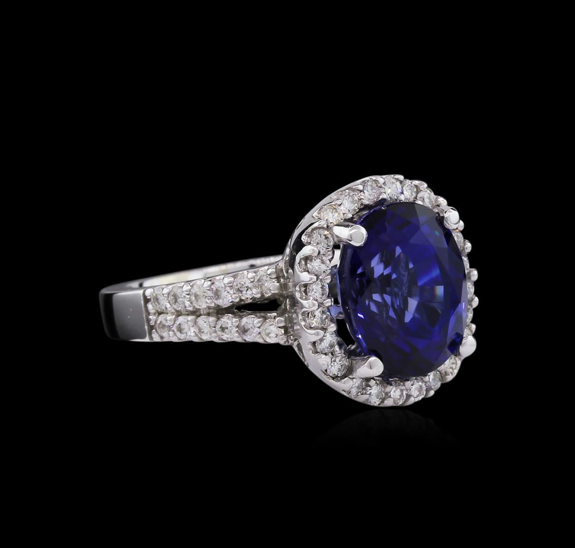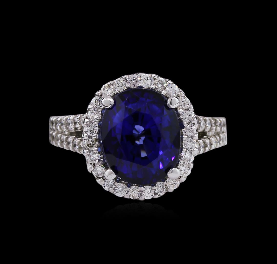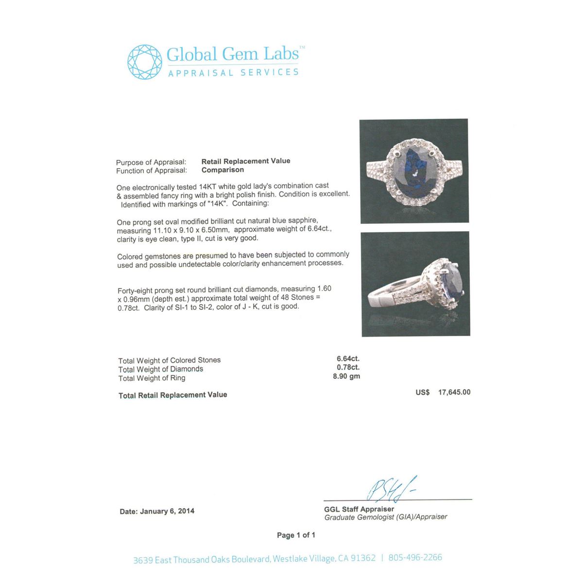 One electronically tested 14KT white gold Ladies combination cast & assembled fancy ring with a bright polish finish. Identified with markings of "14K". Condition is excellent. Containing: One prong set oval modified brilliant cut natural blue sapphire, measuring 11.10 x 9.10 x 6.50mm, approximate weight of 6.64ct., clarity is eye clean, type II, cut is very good. Colored gemstones are presumed to have been subjected to commonly used and possible undetectable color/clarity enhancement processes. Forty-Eight prong set round brilliant cut diamonds, measuring 1.60 x 0.96mm (depth est.) approximate total weight of 48 Stones = 0.78ct. Clarity of SI-1 to SI-2, Color of J - K, Cut is Good. Total Weight of Colored Stones 6.64ct. Total Weight of Diamonds 0.78ct. Total Weight of Ring 8.90gm. GGL Appraised at $17,645.00.