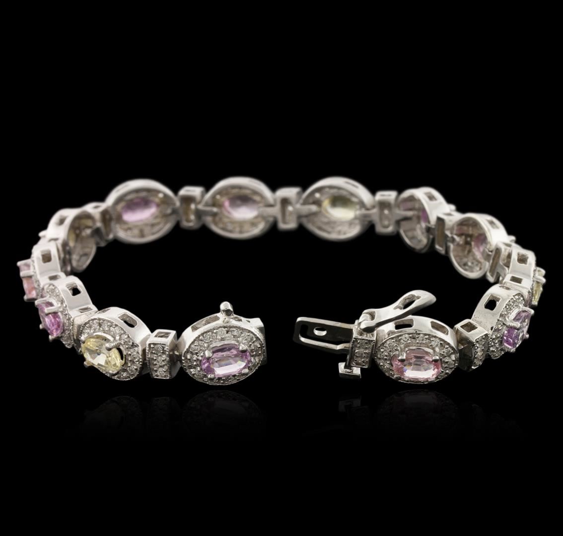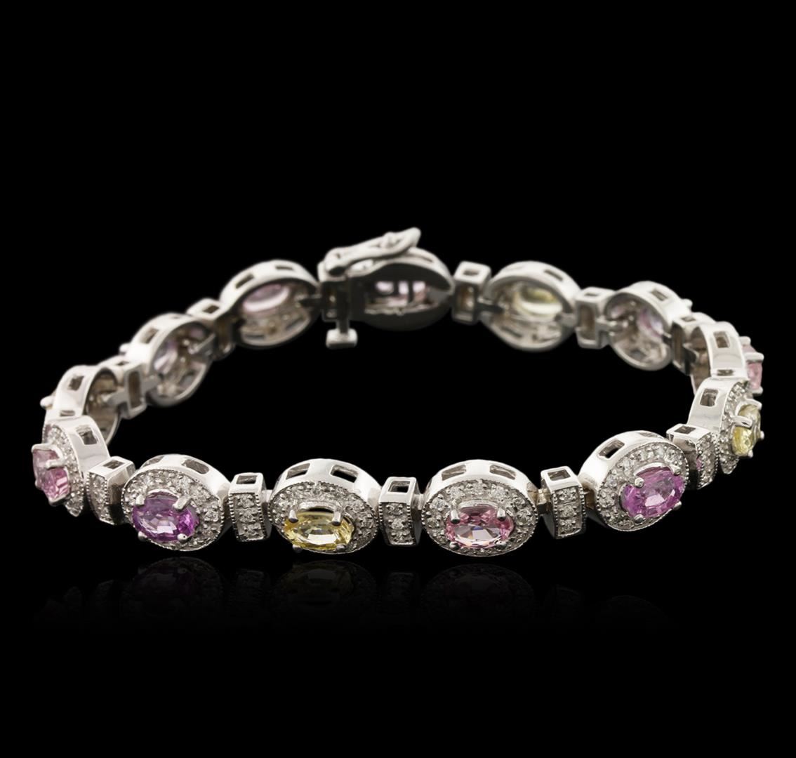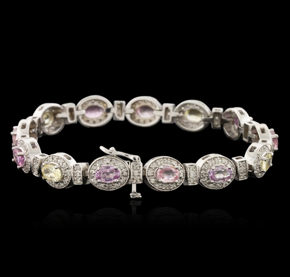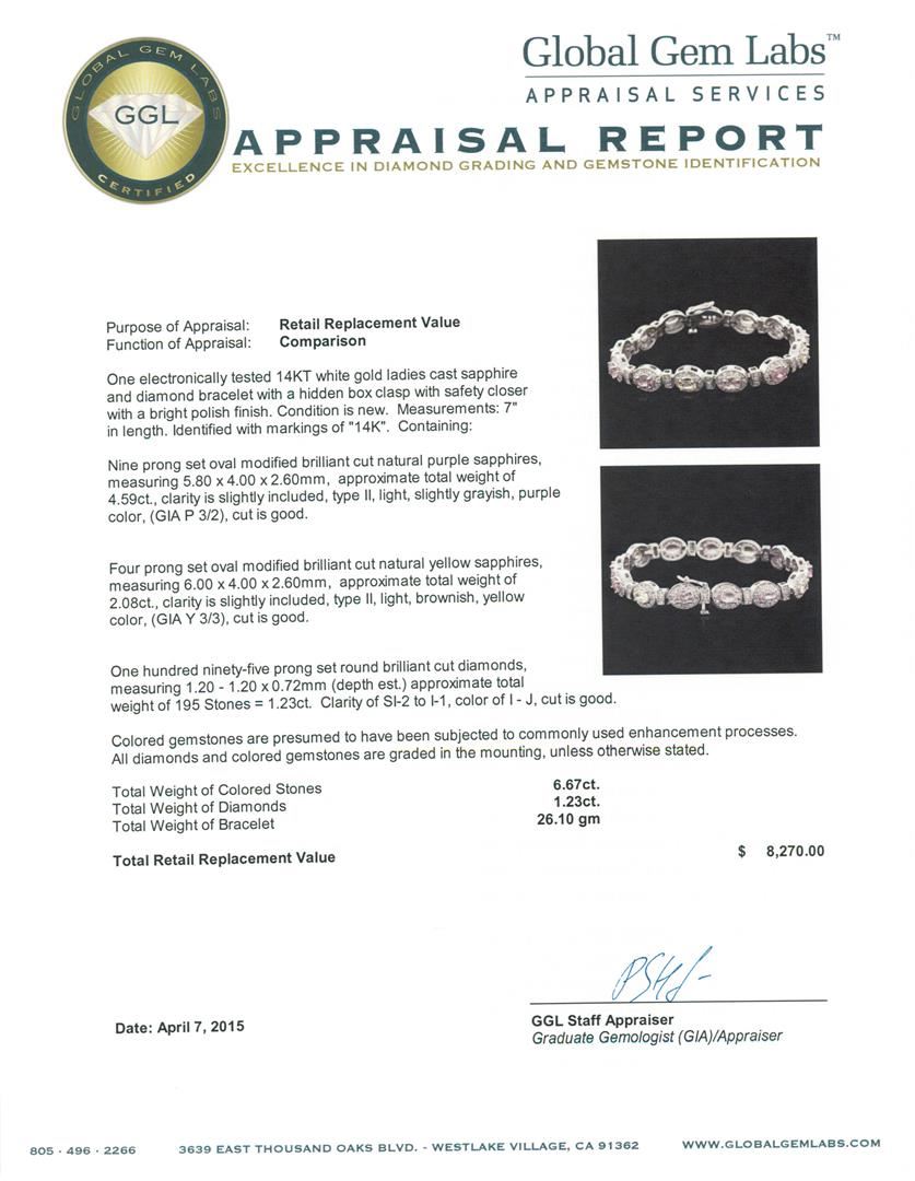 One electronically tested 14KT white gold ladies cast sapphire and diamond bracelet with a hidden box clasp with safety closer with a bright polish finish. Measurements: 7" in length. Identified with markings of "14K". Condition is new. Containing: Nine prong set oval modified brilliant cut natural purple sapphires, measuring 5.80 x 4.00. x 2.60mm, approximate total weight of 4.59ct., clarity is slightly included, type II, light, slightly grayish, purple color, (GIA P 3/2), cut is good. Four prong set oval modified brilliant cut natural yellow sapphires, measuring 6.00. x 4.00. x 2.60mm, approximate total weight of 2.08ct., clarity is slightly included, type II, light, brownish, yellow color, (GIA Y 3/3), cut is good. One Hundred Ninety-Five prong set round brilliant cut diamonds, measuring 1.20 - 1.20 x 0.72mm (depth est.) approximate total weight of 195 Stones = 1.23ct. Clarity: SI-2 to I-1. Color: I - J, Cut is Good. Colored gemstones are presumed to have been subjected to commonly used enhancement processes. All diamonds and colored gemstones are graded in the mounting, unless otherwise stated. Total Weight of Colored Stones 6.67ct. Total Weight of Diamonds 1.23ct. Total Weight of Bracelet 26.10 grams. GGL Appraised at $8,270.00.