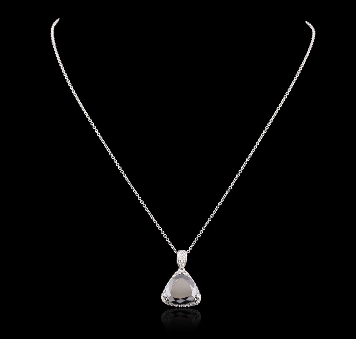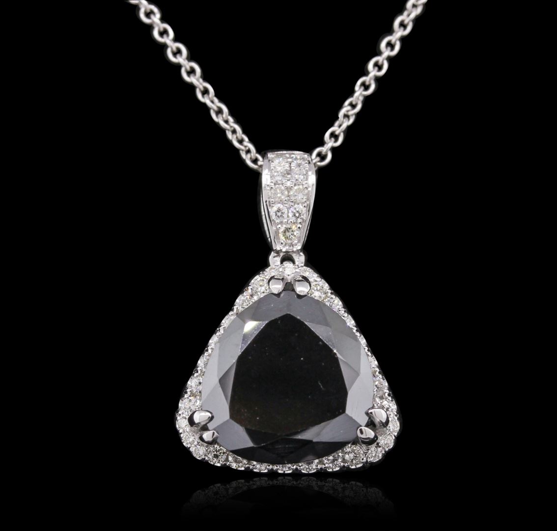 One electronically tested 14KT white gold ladies cast & assembled black and white diamond pendant with chain. Condition is new, good workmanship. The pendant features a black diamond set within a white diamond bezel, completed by a white diamond set bail. The pendant is supported by an eighteen inch length 14KT white gold designer style chain, terminating in a lobster claw clasp. Bright polish finish. Identified with markings of ""14K"". Containing: One prong set triangle cut diamond, measuring 13.00 x 12.90 x 5.80mm (depth est.), 8.00% GTCF approximate weight of 6.08ct. Indications of multiple laboratory enhancements. The specific gravity of black diamond is 3.120 to 3.165. Diamond tester results are non reactive. Graded in the setting. Clarity Declasse, Color Fancy Black; Irradiated Depth 45.0% Table 72.8%. Twenty-Three prong set round brilliant cut diamonds, measuring 1.60 - 1.50 x 0.93mm (depth est.) approximate total weight of 23 Stones = 0.41ct. Graded in the setting. Clarity VS-1 to SI-1 Color G - I Seventeen prong set round brilliant cut diamonds, measuring 1.30 - 1.20 x 0.75mm (depth est.) approximate total weight of 17 Stones = 0.19ct. Graded in the setting. Clarity VS-1 to SI-1 Color G - I Total Weight of Diamonds 6.68 ct. Total Weight of Pendant With Chain 8.21 grams. AIG Appraised at $10,685.00.