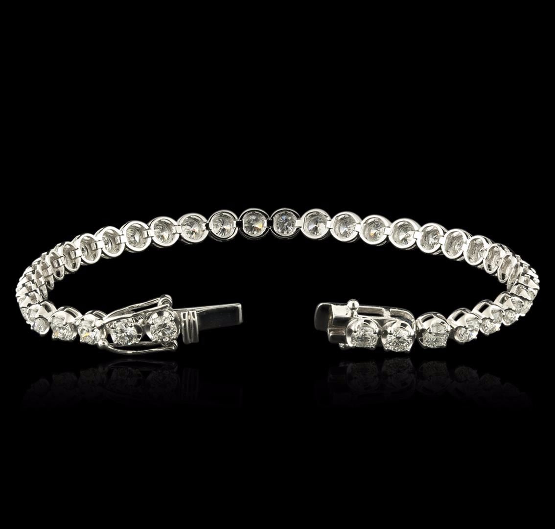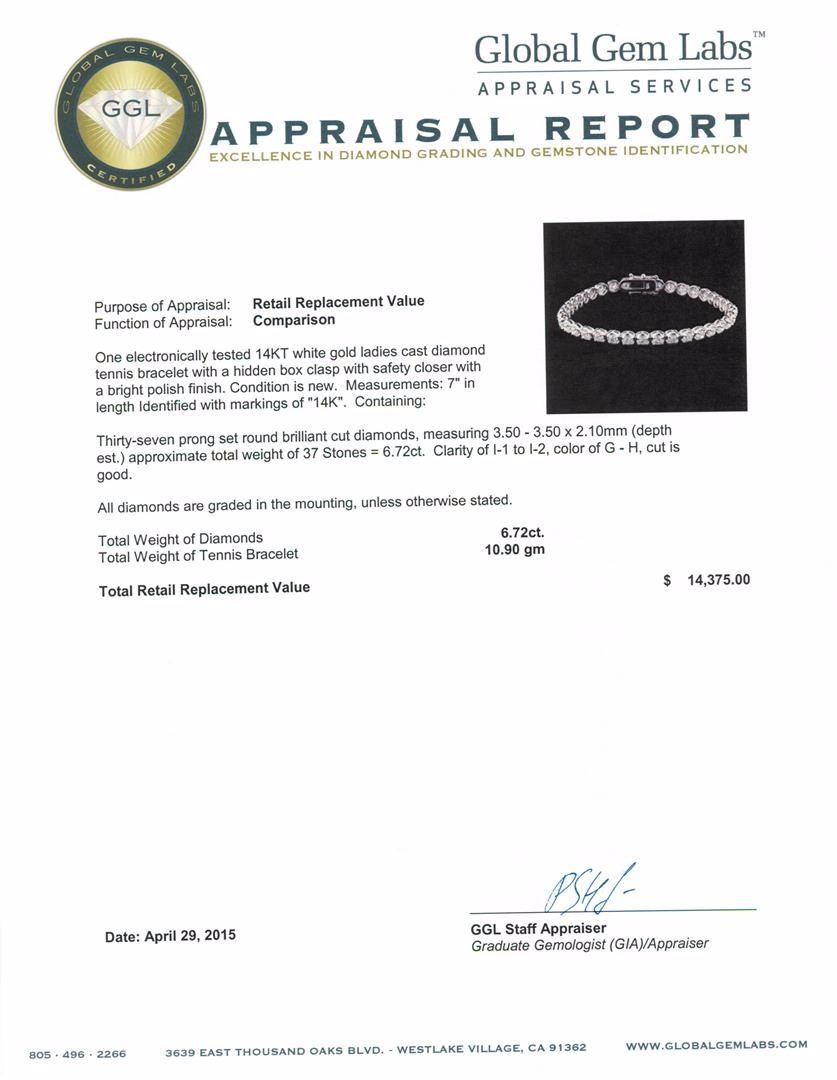 One electronically tested 14KT white gold ladies cast diamond tennis bracelet with a hidden box clasp with safety closer with a bright polish finish. Measurements: 7" in length Identified with markings of "14K". Condition is new. Containing: Thirty-Seven prong set round brilliant cut diamonds, measuring 3.50 - 3.50 x 2.10mm (depth est.) approximate total weight of 37 Stones = 6.72ct. Clarity: I-1 to I-2. Color: G - H, Cut is Good. All diamonds are graded in the mounting, unless otherwise stated. Total Weight of Diamonds 6.72ct. Total Weight of Tennis Bracelet 10.90 grams. GGL Appraised at $14,375.00.