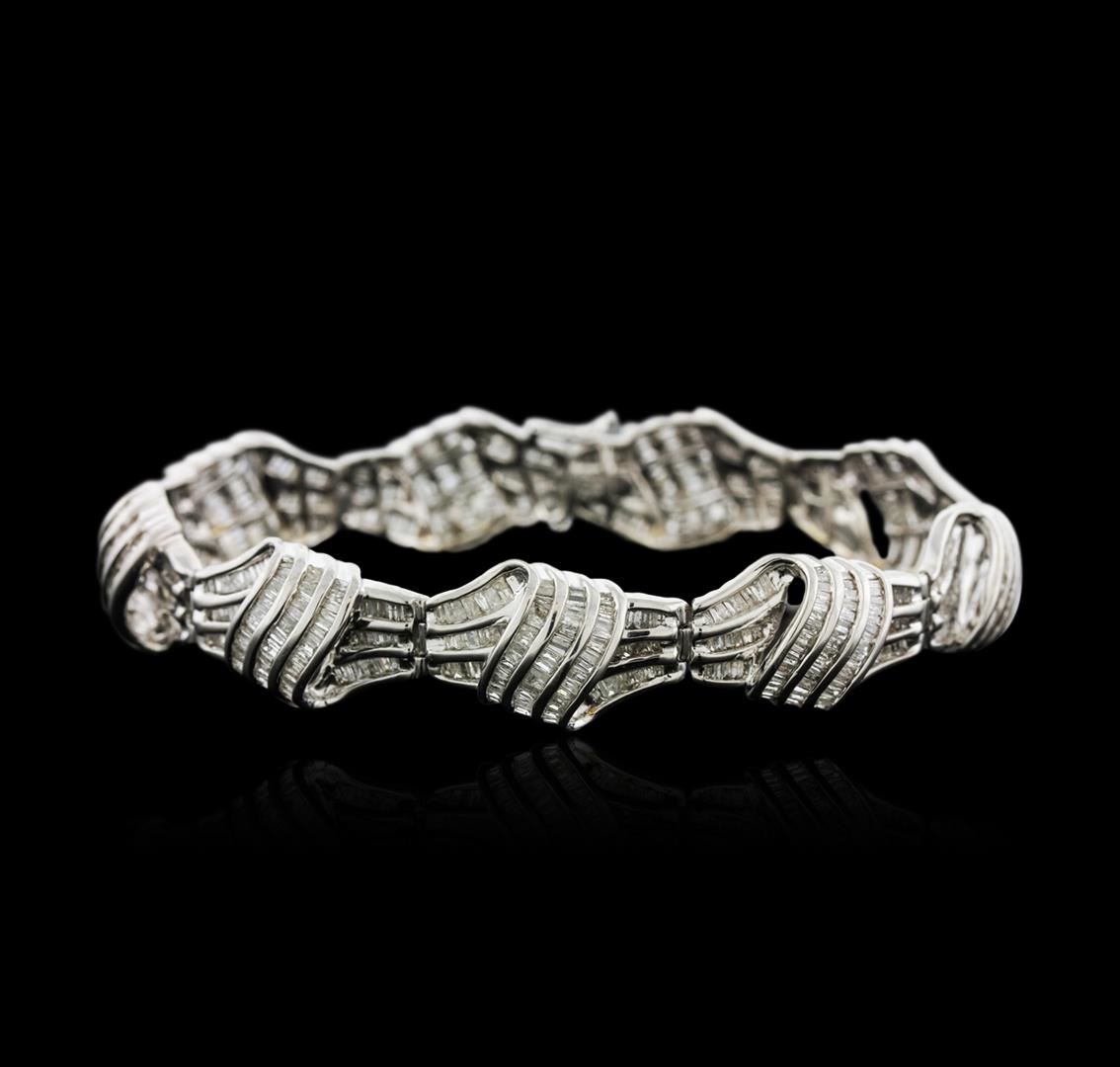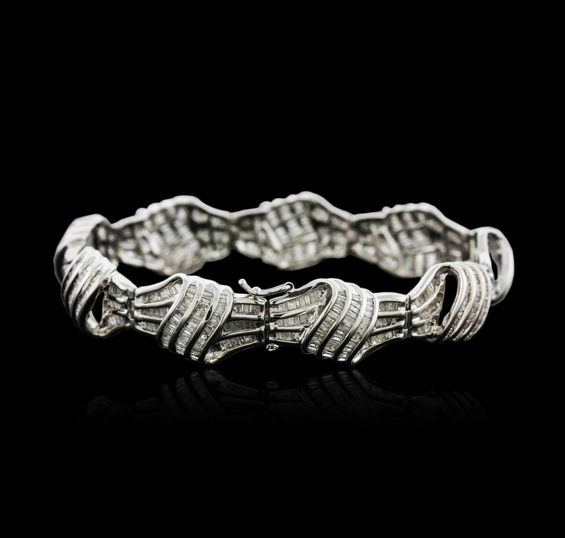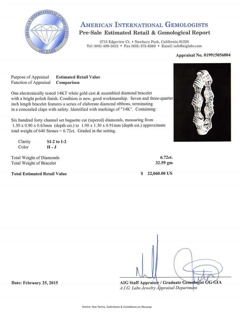 One electronically tested 14KT white gold cast & assembled diamond bracelet with a bright polish finish. Seven and three-quarter inch length bracelet features a series of elaborate diamond ribbons, terminating in a concealed claps with safety. Identified with markings of "14K". Condition is new, good workmanship. Containing: Six Hundred Forty channel set baguette cut (tapered) diamonds, measuring from 1.50 x 0.90 x 0.63mm (depth est.) to 1.90 x 1.30 x 0.91mm (depth est.) approximate total weight of 640 Stones = 6.72ct. Graded in the setting. Clarity: SI-2 to I-2. Color: H - J. Total Weight of Diamonds 6.72ct. Total Weight of Bracelet 32.59 grams. AIG Appraised at $22,060.00.