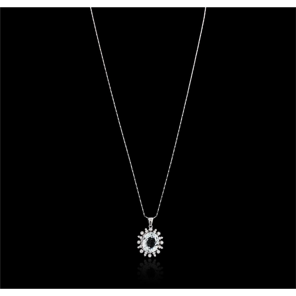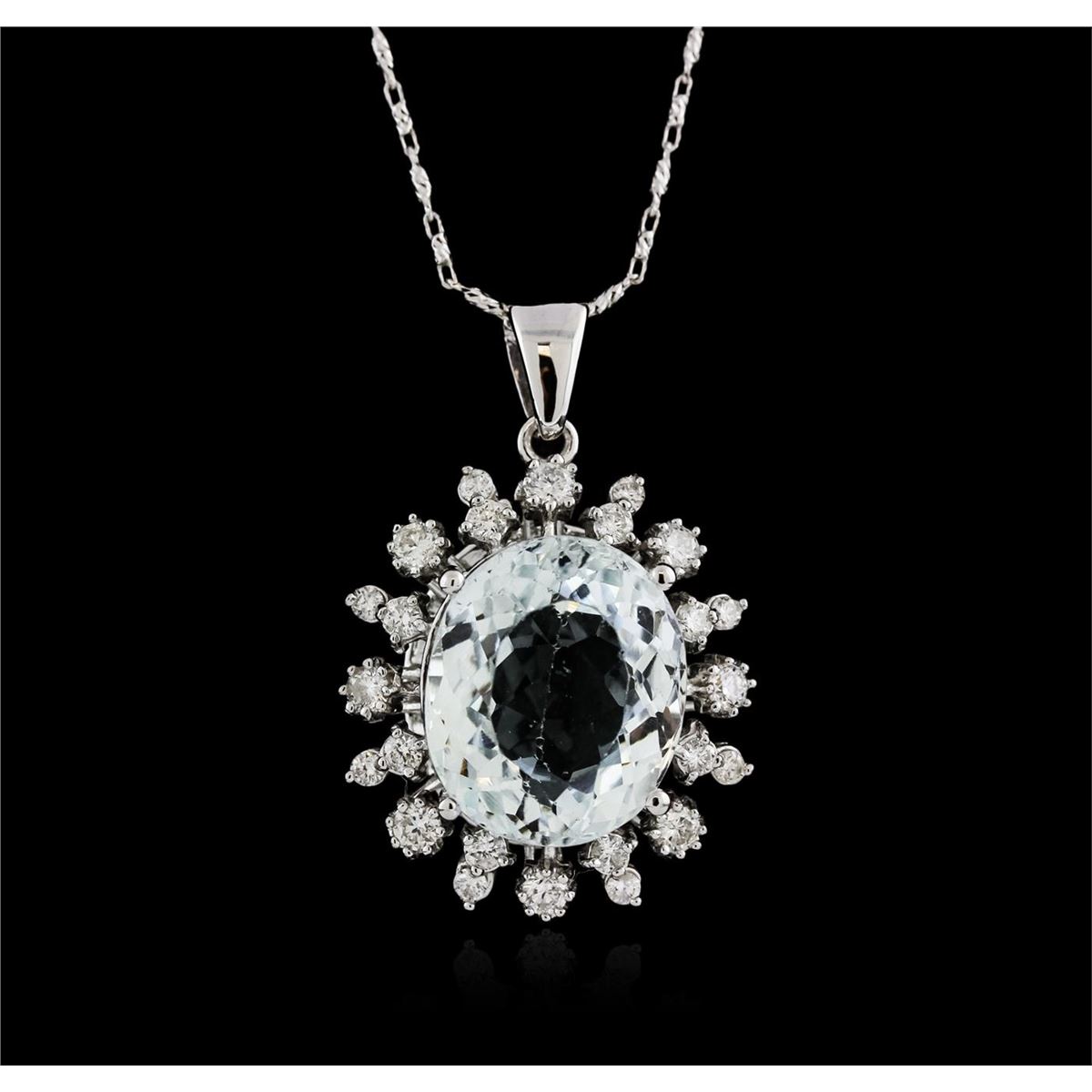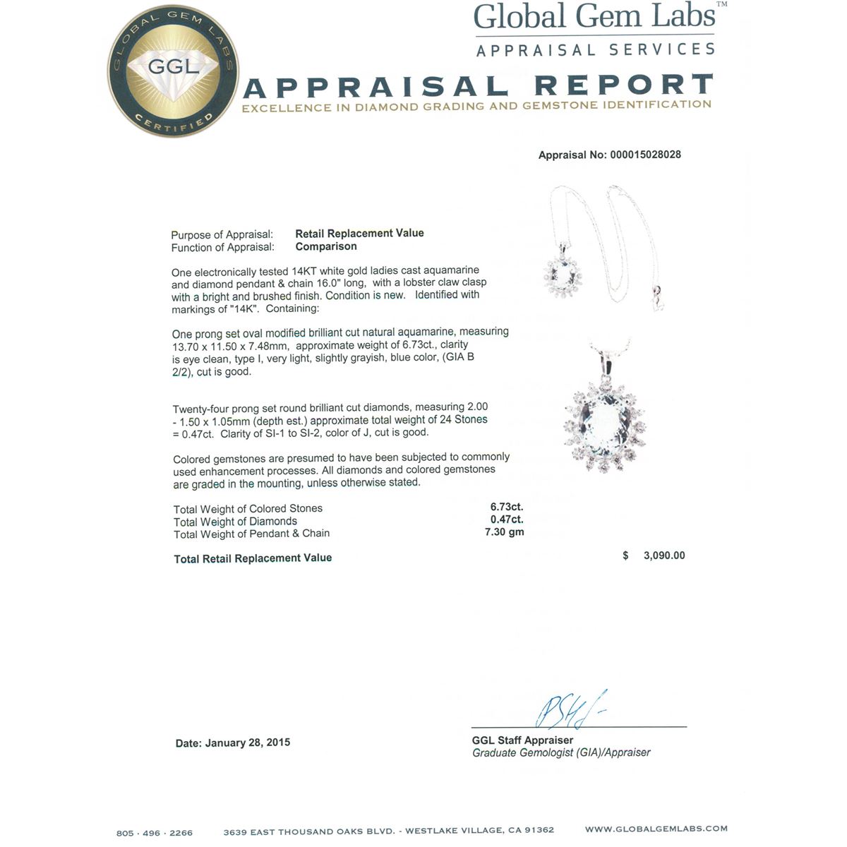 One electronically tested 14KT white gold ladies cast aquamarine and diamond pendant & chain 16.0" long, with a lobster claw clasp with a bright and brushed finish. Identified with markings of "14K". Condition is new. Containing: One prong set oval modified brilliant cut natural aquamarine, measuring 13.70 x 11.50 x 7.48mm, approximate weight of 6.73ct., clarity is eye clean, type I, very light, slightly grayish, blue color, (GIA B 2/2), cut is good. Twenty-Four prong set round brilliant cut diamonds, measuring 2.00 - 1.50 x 1.05mm (depth est.) approximate total weight of 24 Stones = 0.47ct. Clarity: SI-1 to SI-2. Color: J, Cut is Good. Colored gemstones are presumed to have been subjected to commonly used enhancement processes. All diamonds and colored gemstones are graded in the mounting, unless otherwise stated. Total Weight of Colored Stones 6.73ct. Total Weight of Diamonds 0.47ct. Total Weight of Pendant & Chain 7.30 grams. GGL Appraised at $3,090.00.