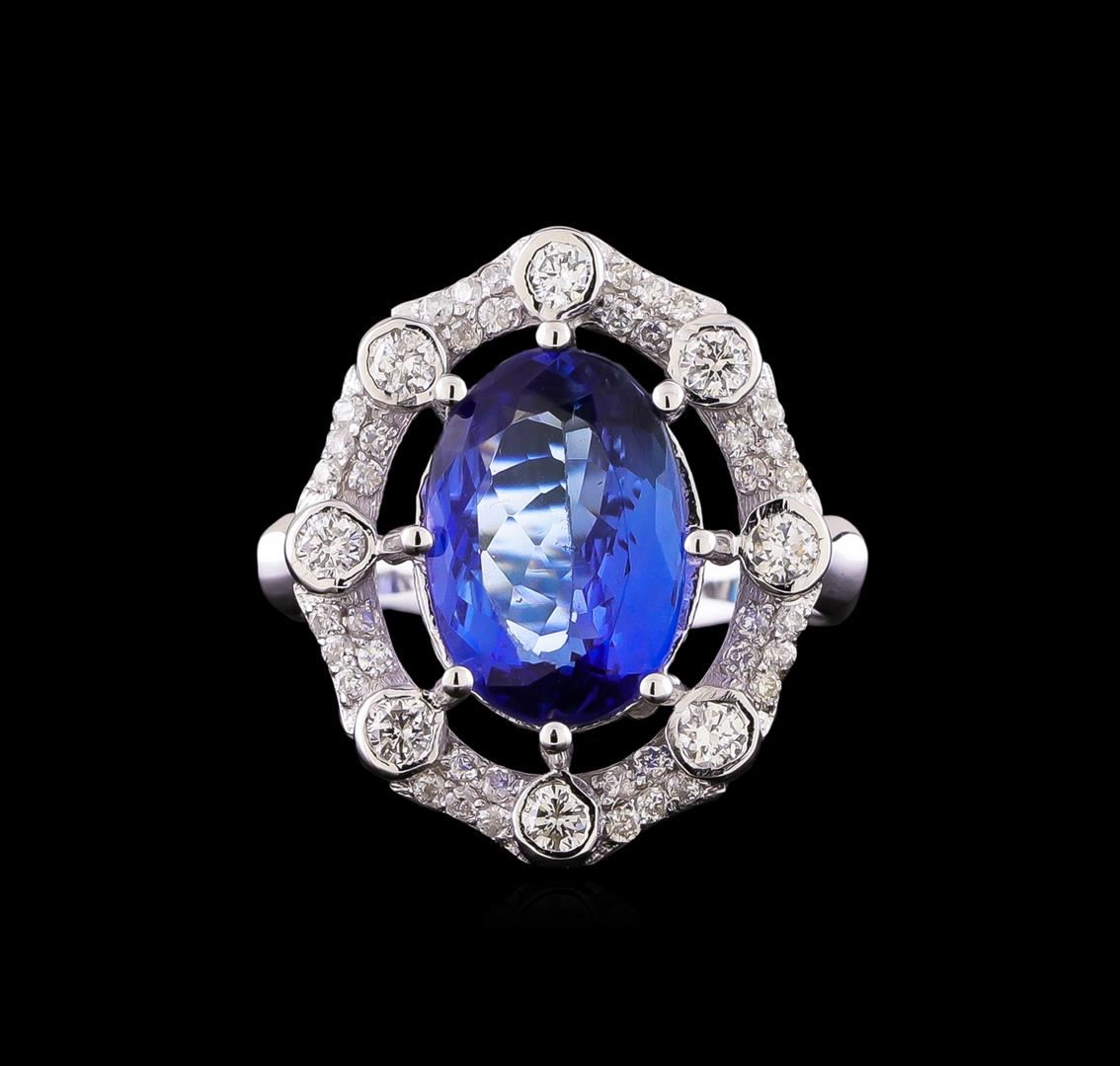 One electronically tested 14KT white gold ladies combination cast & assembled tanzanite and diamond ring with a bright polish finish. Identified with markings of "K14". Condition is new. Containing: One prong set oval oval modified brilliant cut natural tanzanite, measuring 12.35 x 10.00 x 6.50mm, approximate weight of 6.74ct., clarity is eye clean, type II, medium, moderately strong, violet color, (GIA V 5/4), cut is good. Eight prong set round brilliant cut diamonds, measuring 1.70 - 1.70 x 1.02mm (depth est.) approximate total weight of 8 Stones = 0.14ct. Clarity: SI-1 to SI-2. Color: I - J, Cut is Good. Forty-Five prong set round brilliant cut diamonds, measuring 1.00 - 1.00 x 0.60mm (depth est.) approximate total weight of 45 Stones = 0.16ct. Clarity: I-1. Color: I - J, Cut is Good. Colored gemstones are presumed to have been subjected to commonly used enhancement processes. All diamonds and colored gemstones are graded in the mounting, unless otherwise stated. Total Weight of Colored Stones 6.74ct. Total Weight of Diamonds 0.31ct. Total Weight of Ring 4.30 grams. GGL Appraised at $5,995.00.