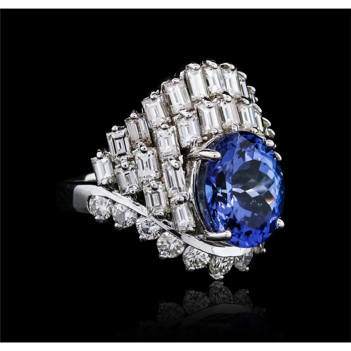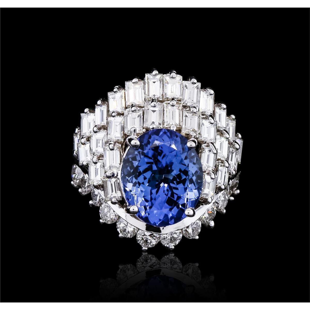 One polished, stamped, and electronically tested solid 14KT White Gold ring mounted with: 1 genuine tanzanite center stone weighing 6.74 carats, 28 genuine baguette cut diamonds weighing 3.21 carats, and 12 genuine round diamonds weighing 1.02 carats. This item weighs 10.4 grams, condition is new, excellent workmanship. AIGL Appraised at $27,175.00.
