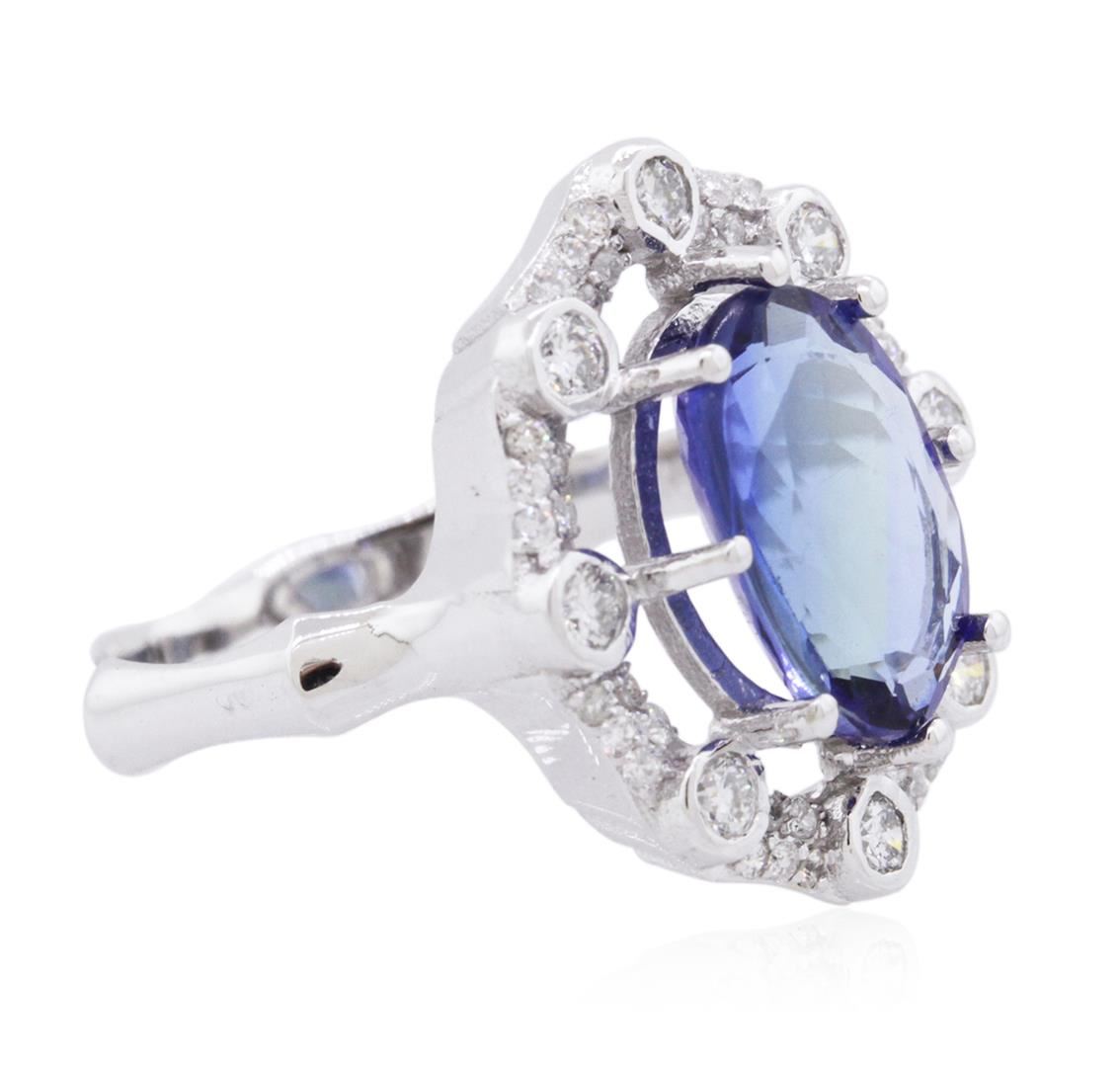 One electronically tested 14KT white gold ladies combination cast & assembled tanzanite and diamond ring with a bright polish finish. Identified with markings of "K14". Condition is new. Containing: One prong set oval oval modified brilliant cut natural tanzanite, measuring 12.35 x 10.00 x 6.50mm, approximate weight of 6.74ct., clarity is eye clean, type II, medium, moderately strong, violet color, (GIA V 5/4), cut is good. Eight prong set round brilliant cut diamonds, measuring 1.70 - 1.70 x 1.02mm (depth est.) approximate total weight of 8 Stones = 0.14ct. Clarity: SI-1 to SI-2. Color: I - J, Cut is Good. Forty-Five prong set round brilliant cut diamonds, measuring 1.00 - 1.00 x 0.60mm (depth est.) approximate total weight of 45 Stones = 0.16ct. Clarity: I-1. Color: I - J, Cut is Good. Colored gemstones are presumed to have been subjected to commonly used enhancement processes. All diamonds and colored gemstones are graded in the mounting, unless otherwise stated. Total Weight of Colored Stones 6.74ct. Total Weight of Diamonds 0.31ct. Total Weight of Ring 4.30 grams. GGL Appraised at $5,995.00.
