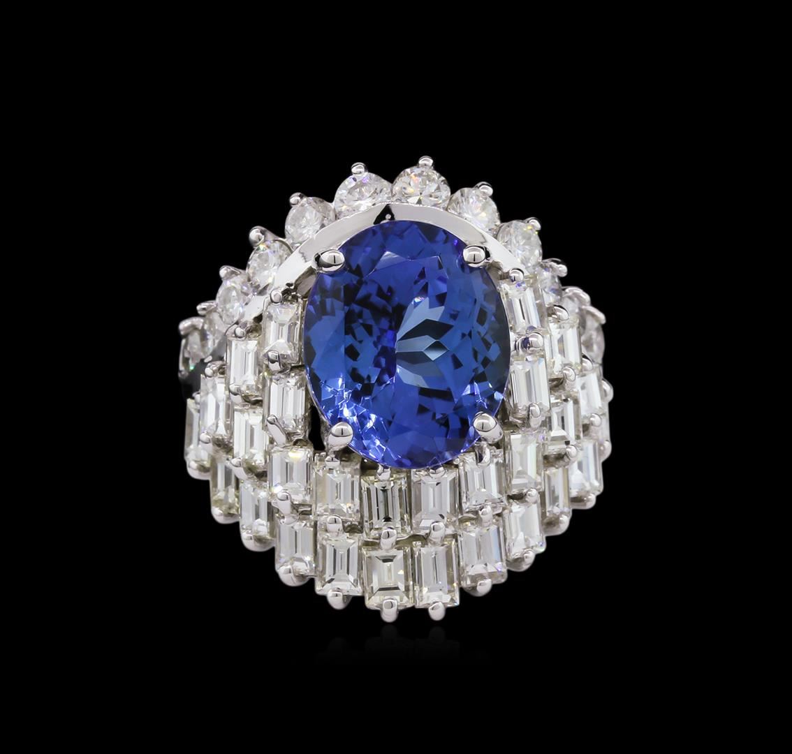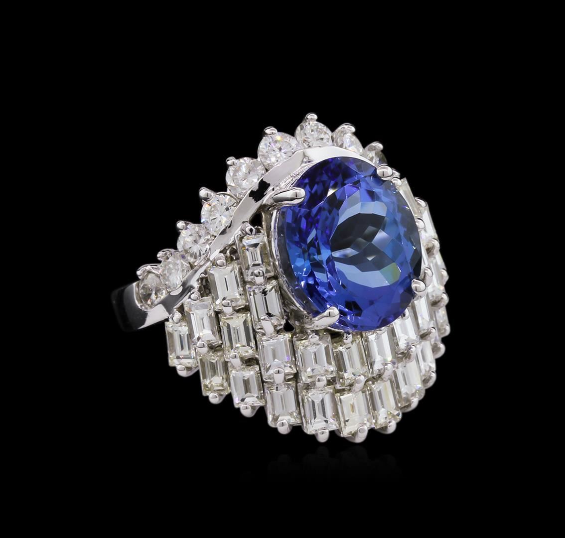 One polished, stamped, and electronically tested solid 14KT White Gold ring mounted with: 1 genuine tanzanite center stone weighing 6.74 carats, 28 genuine baguette cut diamonds weighing 3.21 carats, and 12 genuine round diamonds weighing 1.02 carats. This item weighs 10.4 grams, condition is new, excellent workmanship. AIGL Appraised at $27,175.00.
