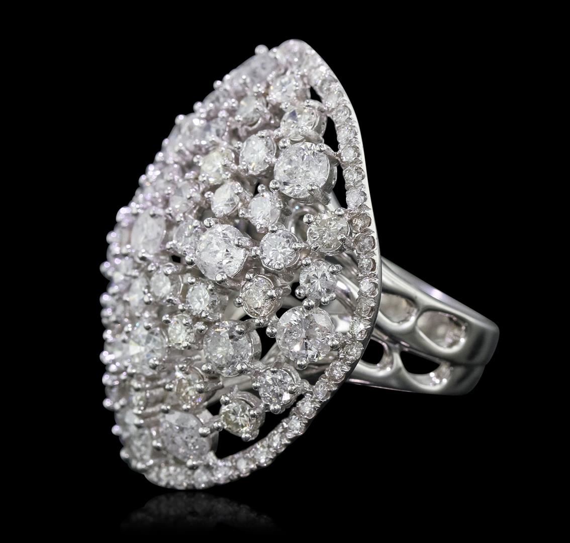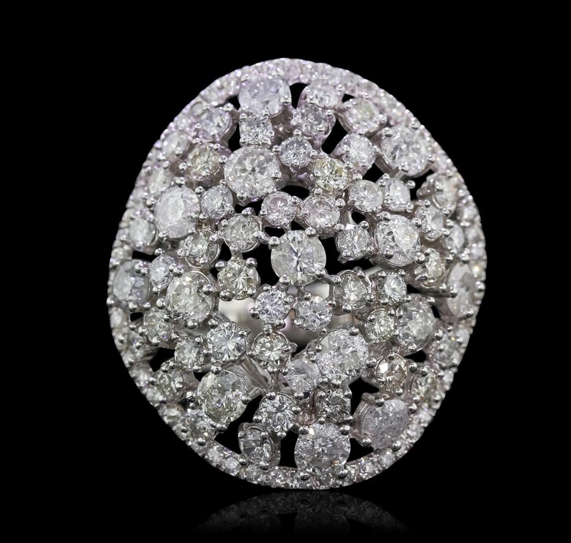 One electronically tested 14KT white gold Ladies combination cast & assembled ring with a bright polish finish. Condition is new. Identified with markings of "14K". Containing: Fifty-Seven prong set round brilliant cut diamonds, measuring 1.40 - 1.40 x 0.84mm (depth est.) approximate. Total Weight of 57 Stones = 0.57ct. Clarity: I-1 to I-2. Color: H - I, Cut is Good. Forty-Five prong set round brilliant cut diamonds, measuring 2.70 - 2.50 x 1.56mm (depth est.) approximate. Total Weight of 45 Stones = 2.89ct. Clarity: SI-2 to I-2. Color: I - J. Fourteen prong set round brilliant cut diamonds, measuring 4.00 - 4.00 x 2.40mm (depth est.) approximate. Total Weight of 14 Stones = 3.28ct. Clarity: I-1 to I-3. Color: I - K. Total Weight of Diamonds 6.74ct. Total Weight of Ring 19.10 grams. GGL Appraised at $20,535.00.