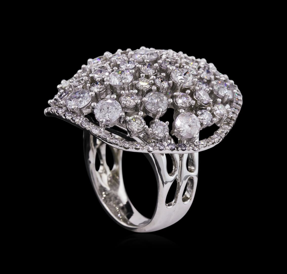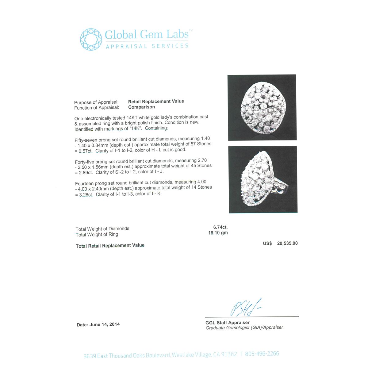 One electronically tested 14KT white gold Ladies combination cast & assembled ring with a bright polish finish. Condition is new. Identified with markings of "14K". Containing: Fifty-Seven prong set round brilliant cut diamonds, measuring 1.40 - 1.40 x 0.84mm (depth est.) approximate. Total Weight of 57 Stones = 0.57ct. Clarity: I-1 to I-2. Color: H - I, Cut is Good. Forty-Five prong set round brilliant cut diamonds, measuring 2.70 - 2.50 x 1.56mm (depth est.) approximate. Total Weight of 45 Stones = 2.89ct. Clarity: SI-2 to I-2. Color: I - J. Fourteen prong set round brilliant cut diamonds, measuring 4.00 - 4.00 x 2.40mm (depth est.) approximate. Total Weight of 14 Stones = 3.28ct. Clarity: I-1 to I-3. Color: I - K. Total Weight of Diamonds 6.74ct. Total Weight of Ring 19.10 grams. GGL Appraised at $20,535.00.