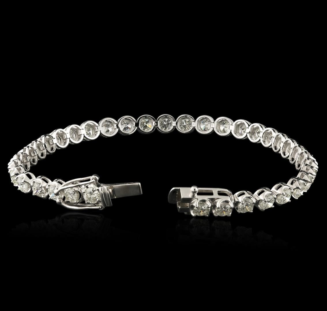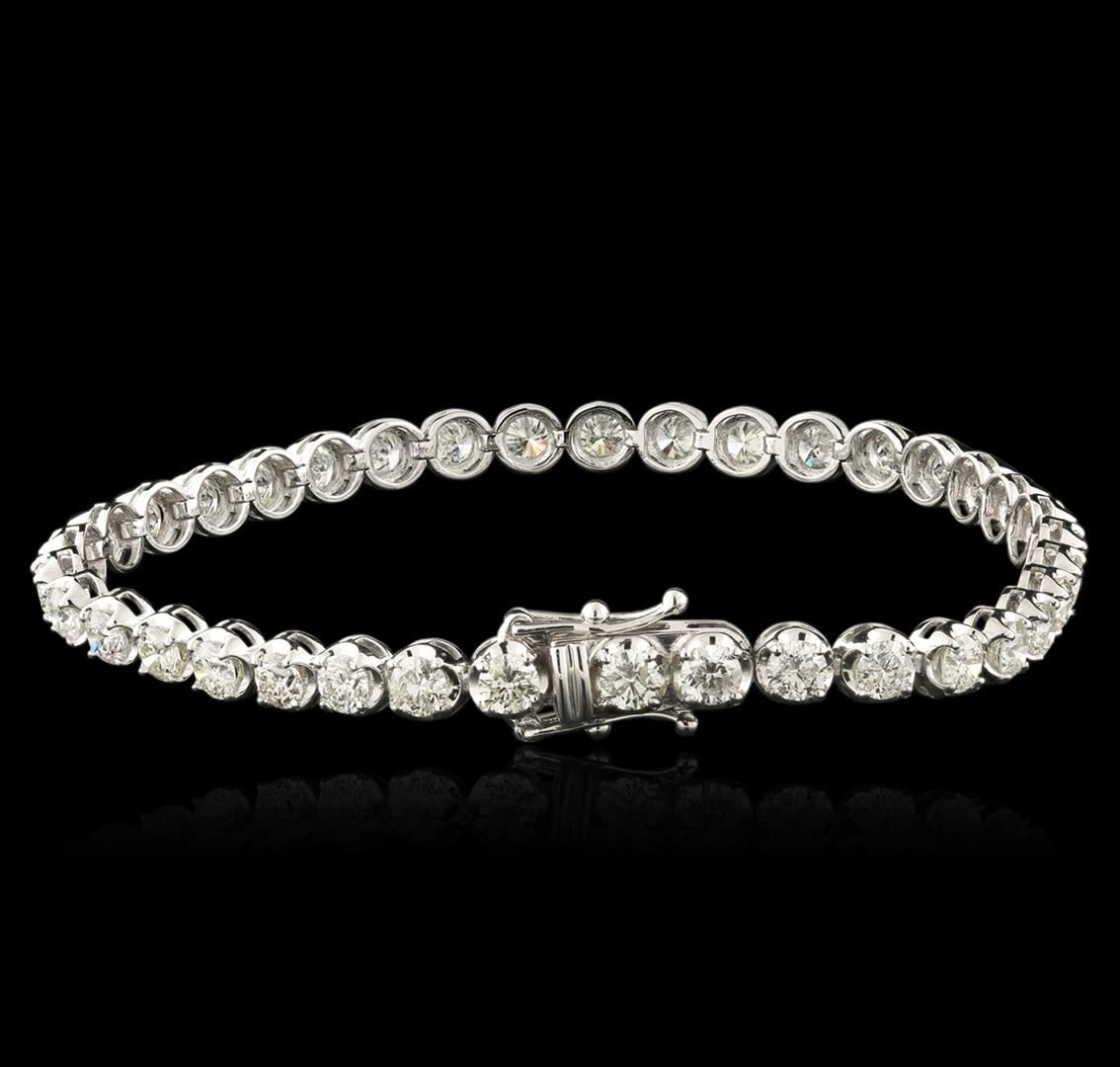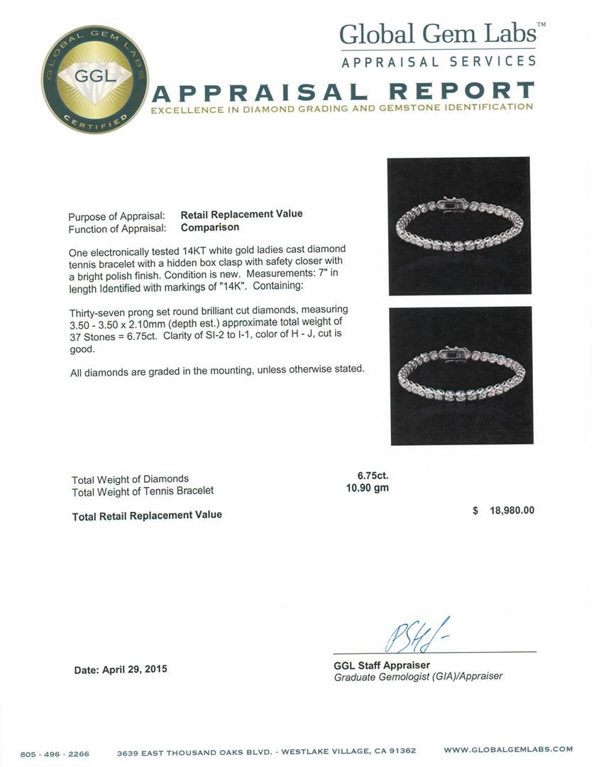 One electronically tested 14KT white gold ladies cast diamond tennis bracelet with a hidden box clasp with safety closer with a bright polish finish. Measurements: 7" in length Identified with markings of "14K". Condition is new. Containing: Thirty-Seven prong set round brilliant cut diamonds, measuring 3.50 - 3.50 x 2.10mm (depth est.) approximate total weight of 37 Stones = 6.75ct. Clarity: SI-2 to I-1. Color: H - J, Cut is Good. All diamonds are graded in the mounting, unless otherwise stated. Total Weight of Diamonds 6.75ct. Total Weight of Tennis Bracelet 10.90 grams. GGL Appraised at $18,980.00.