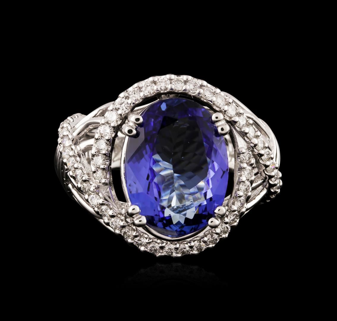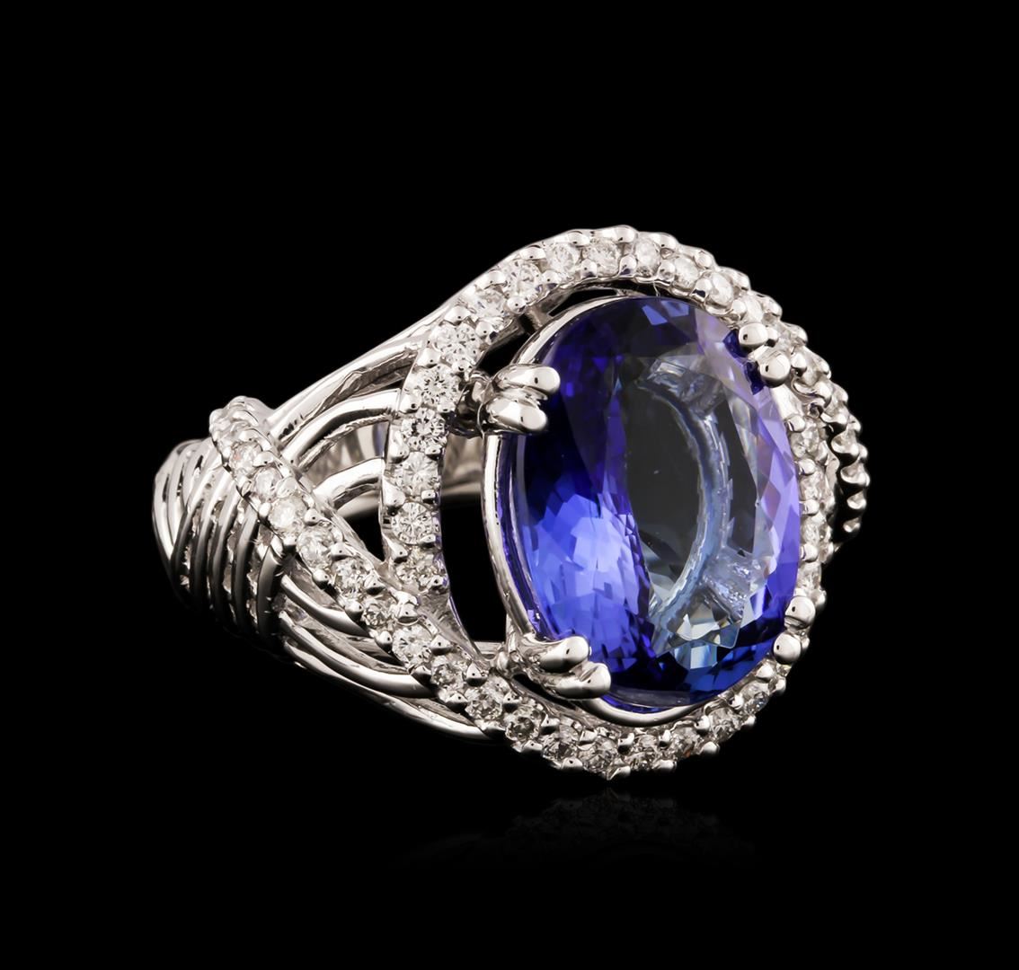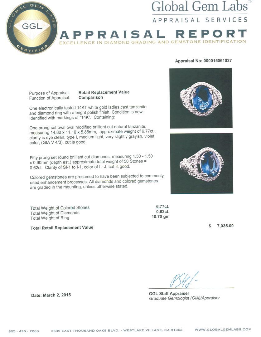 One electronically tested 14KT white gold ladies cast tanzanite and diamond ring with a bright polish finish. Identified with markings of "14K". Condition is new. Containing: One prong set oval oval modified brilliant cut natural tanzanite, measuring 14.80 x 11.10 x 5.86mm, approximate weight of 6.77ct., clarity is eye clean, type I, medium light, very slightly grayish, violet color, (GIA V 4/3), cut is good. Fifty prong set round brilliant cut diamonds, measuring 1.50 - 1.50 x 0.90mm (depth est.) approximate total weight of 50 Stones = 0.62ct. Clarity: SI-1 to I-1. Color: I - J, Cut is Good. Colored gemstones are presumed to have been subjected to commonly used enhancement processes. All diamonds and colored gemstones are graded in the mounting, unless otherwise stated. Total Weight of Colored Stones 6.77ct. Total Weight of Diamonds 0.62ct. Total Weight of Ring 10.70 grams. GGL Appraised at $7,035.00.