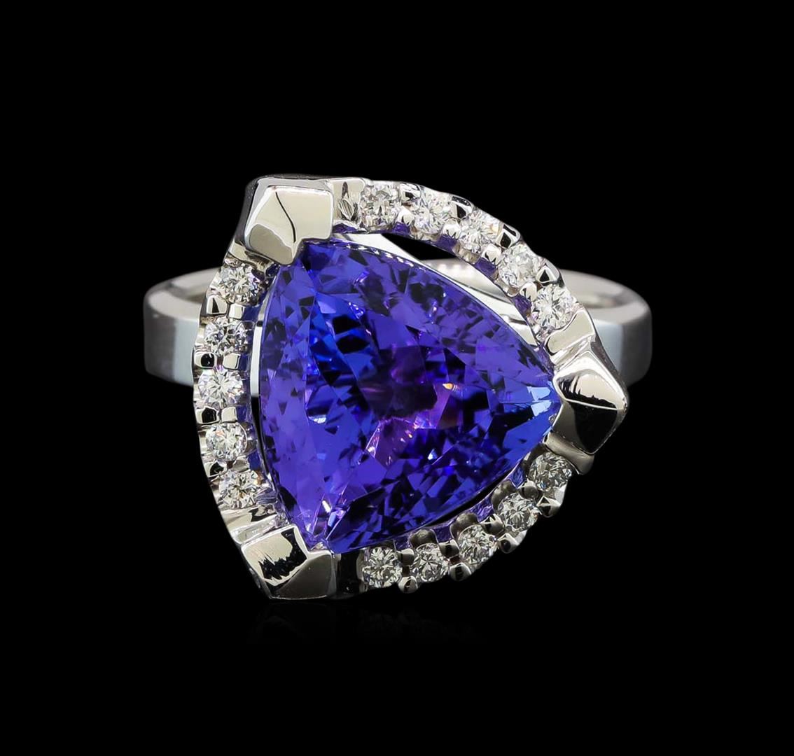 One electronically tested 14KT white gold ladies cast tanzanite and diamond ring with a bright polish finish. Identified with markings of "14K". Condition is new. Containing: One prong set triangle modified brilliant cut natural tanzanite, measuring 12.00 x 12.00 x 7.81mm, approximate weight of 6.78ct., clarity is eye clean, type I, medium light, moderately strong, violet color, (GIA V 4/4), cut is good. Fifteen prong set round brilliant cut diamonds, measuring 1.50 - 1.50 x 0.90mm (depth est.) approximate total weight of 15 Stones = 0.19ct. Clarity: SI-1 to SI-2. Color: H - I, Cut is Good. Colored gemstones are presumed to have been subjected to commonly used enhancement processes. All diamonds and colored gemstones are graded in the mounting, unless otherwise stated. Total Weight of Colored Stones 6.78ct. Total Weight of Diamonds 0.19ct. Total Weight of Ring 9.80 grams. GGL Appraised at $6,380.00.