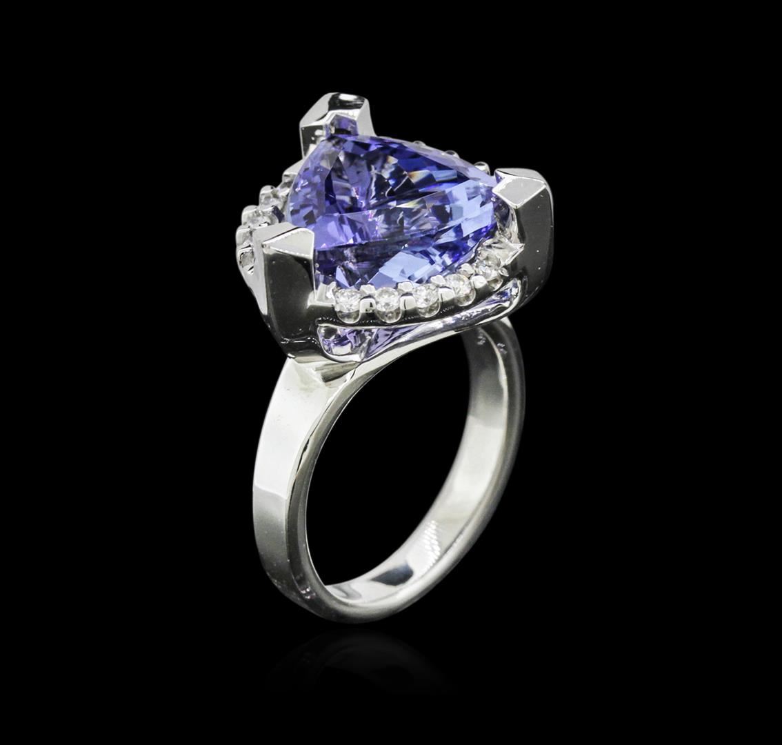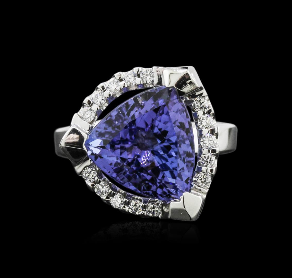 One electronically tested 14KT white gold ladies cast tanzanite and diamond ring with a bright polish finish. Identified with markings of "14K". Condition is new. Containing: One prong set triangle modified brilliant cut natural tanzanite, measuring 12.00 x 12.00 x 7.81mm, approximate weight of 6.78ct., clarity is eye clean, type I, medium light, moderately strong, violet color, (GIA V 4/4), cut is good. Fifteen prong set round brilliant cut diamonds, measuring 1.50 - 1.50 x 0.90mm (depth est.) approximate total weight of 15 Stones = 0.19ct. Clarity: SI-1 to SI-2. Color: H - I, Cut is Good. Colored gemstones are presumed to have been subjected to commonly used enhancement processes. All diamonds and colored gemstones are graded in the mounting, unless otherwise stated. Total Weight of Colored Stones 6.78ct. Total Weight of Diamonds 0.19ct. Total Weight of Ring 9.80 grams. GGL Appraised at $6,380.00.