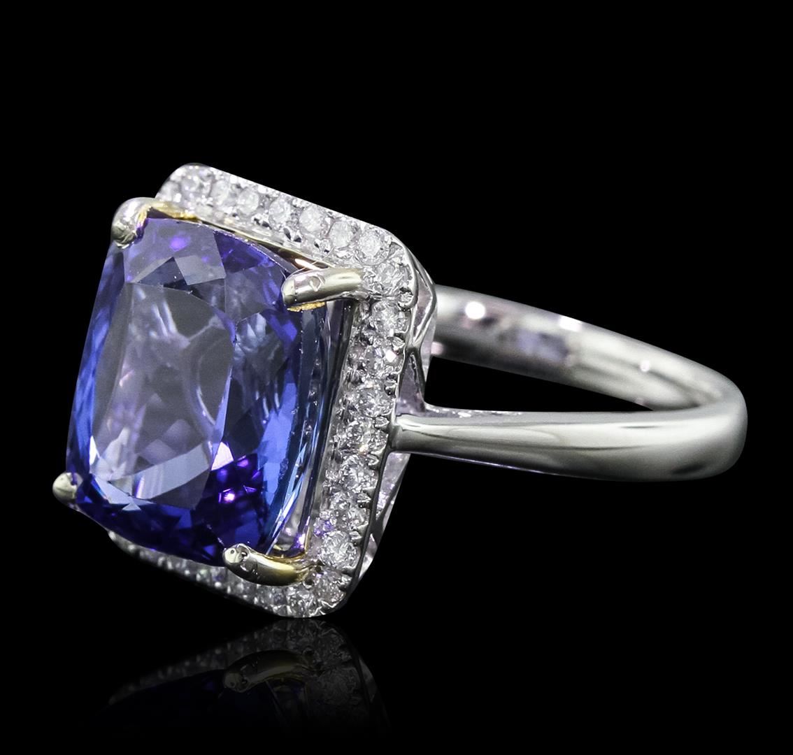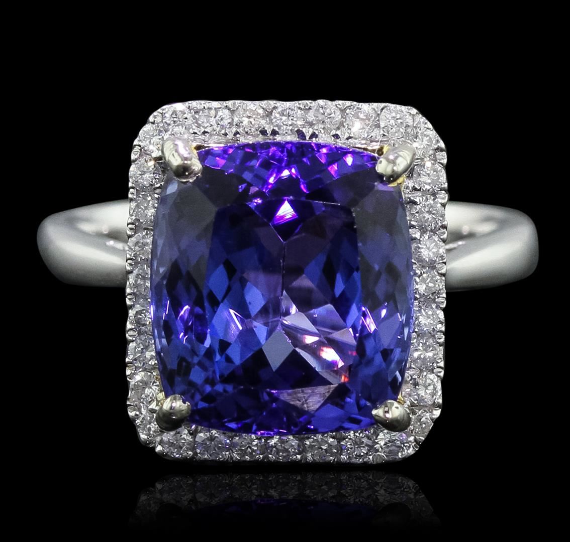 One electronically tested 14KT white gold Ladies combination cast & assembled ring with a bright polish finish. Condition is new. Identified with markings of "14K". Containing: One prong set rectangular cushion modified brilliant cut natural tanzanite, measuring 11.50 x 10.50 x 7.15mm, approximate weight of 6.80ct., clarity is eye clean, type I, medium, moderately strong, violetish blue color, (GIA vB 5/4), cut is good. Colored gemstones are presumed to have been subjected to commonly used color/clarity enhancement processes. Thirty prong set round brilliant cut diamonds, measuring 1.40 - 1.40 x 0.84mm (depth est.) approximate. Total Weight of 30 Stones = 0.30ct. Clarity: I-1 to I-2. Color: I - J, Cut is Good. Total Weight of Colored Stones 6.80ct. Total Weight of Diamonds 0.30ct. Total Weight of Ring 5.90 grams. GGL Appraised at $11,755.00.