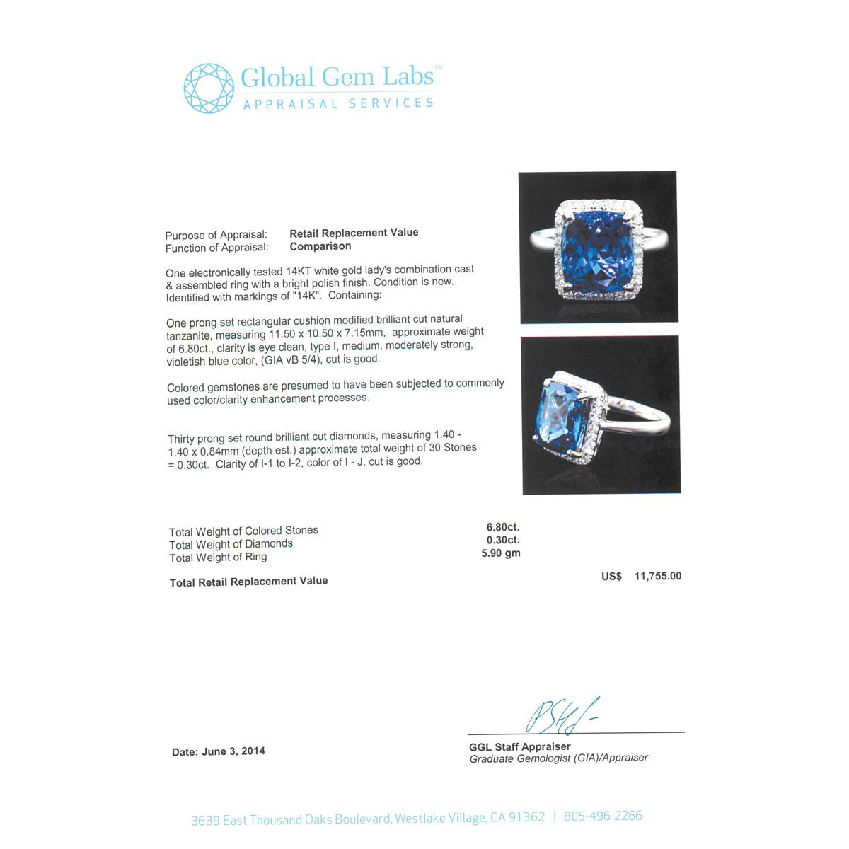 One electronically tested 14KT white gold Ladies combination cast & assembled ring with a bright polish finish. Condition is new. Identified with markings of "14K". Containing: One prong set rectangular cushion modified brilliant cut natural tanzanite, measuring 11.50 x 10.50 x 7.15mm, approximate weight of 6.80ct., clarity is eye clean, type I, medium, moderately strong, violetish blue color, (GIA vB 5/4), cut is good. Colored gemstones are presumed to have been subjected to commonly used color/clarity enhancement processes. Thirty prong set round brilliant cut diamonds, measuring 1.40 - 1.40 x 0.84mm (depth est.) approximate. Total Weight of 30 Stones = 0.30ct. Clarity: I-1 to I-2. Color: I - J, Cut is Good. Total Weight of Colored Stones 6.80ct. Total Weight of Diamonds 0.30ct. Total Weight of Ring 5.90 grams. GGL Appraised at $11,755.00.