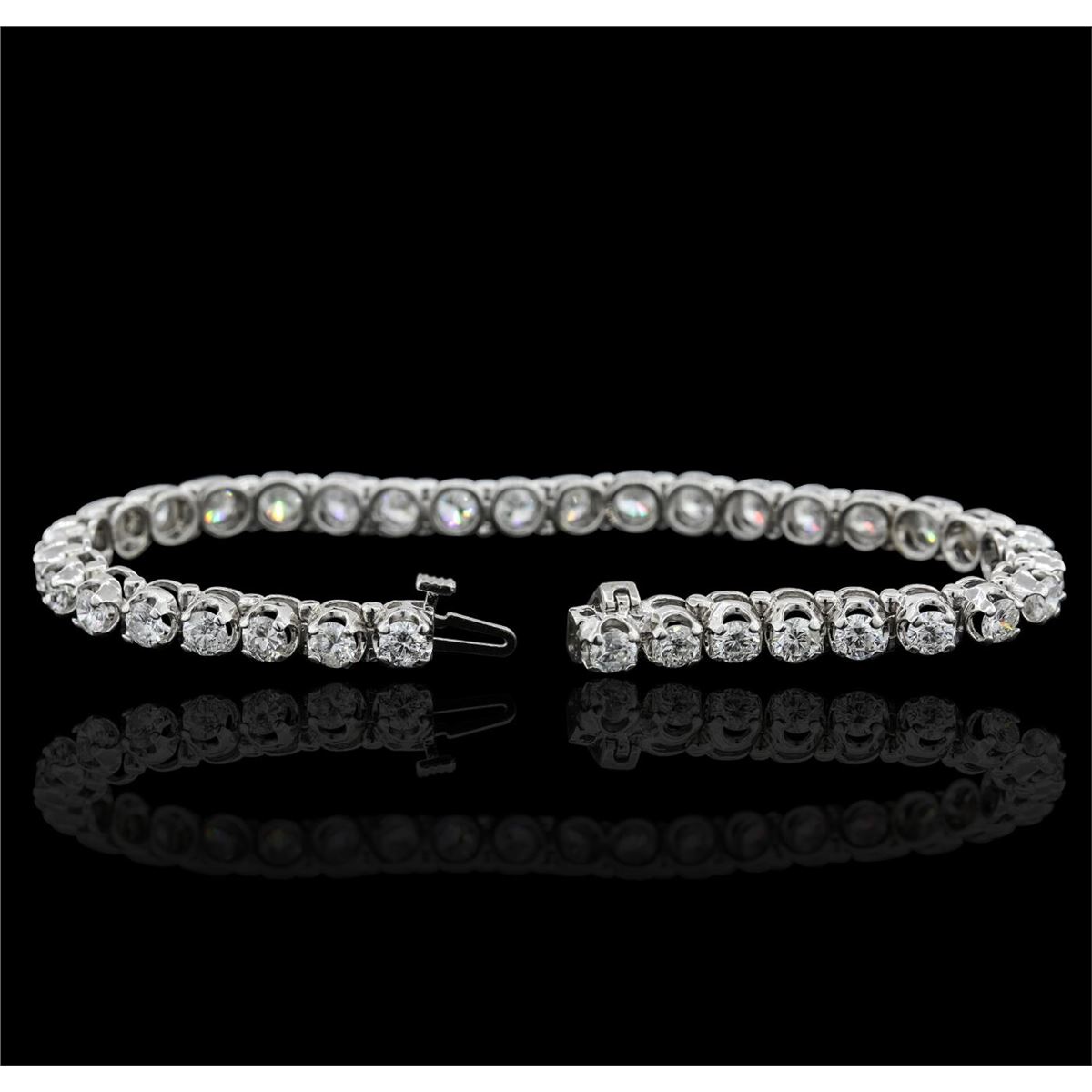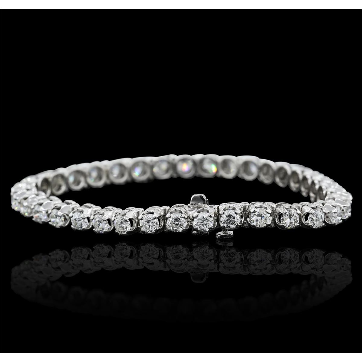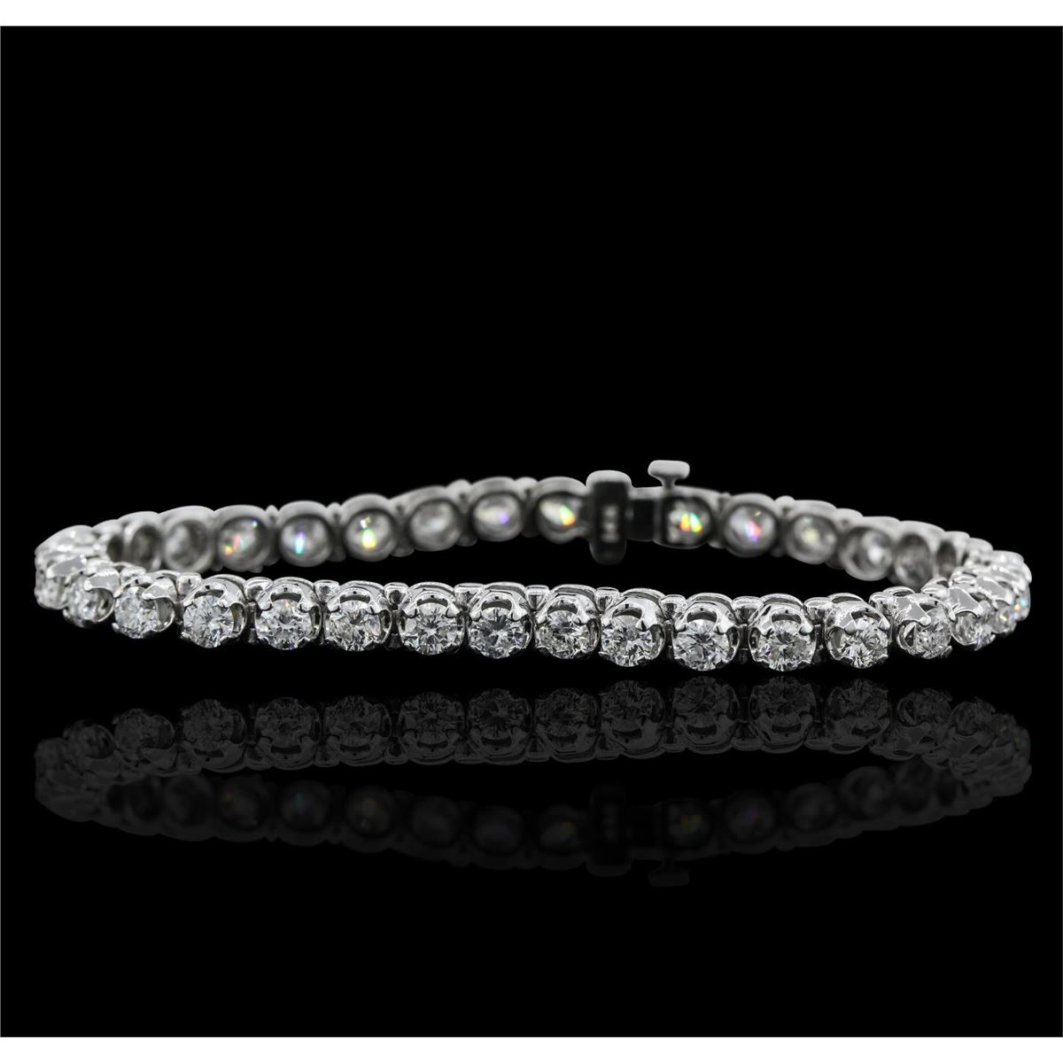 One electronically tested 14KT white gold ladies combination cast & assembled tennis bracelet with a hidden box clasp with a bright polish finish. Condition is new. Measurements: 6.85" in length. Identified with markings of "14K". Containing: Thirty-Five prong set round brilliant cut diamonds, measuring 3.50 - 3.50 x 2.10mm (depth est.) approximate total weight of 35 Stones = 6.80ct. Clarity: SI-2 to I-1. Color: H - J, Cut is Good. All diamonds are graded in the mounting, unless otherwise stated. Total Weight of Diamonds 6.80ct. Total Weight of Bracelet 16.10 grams. GGL Appraised at $29,615.00.