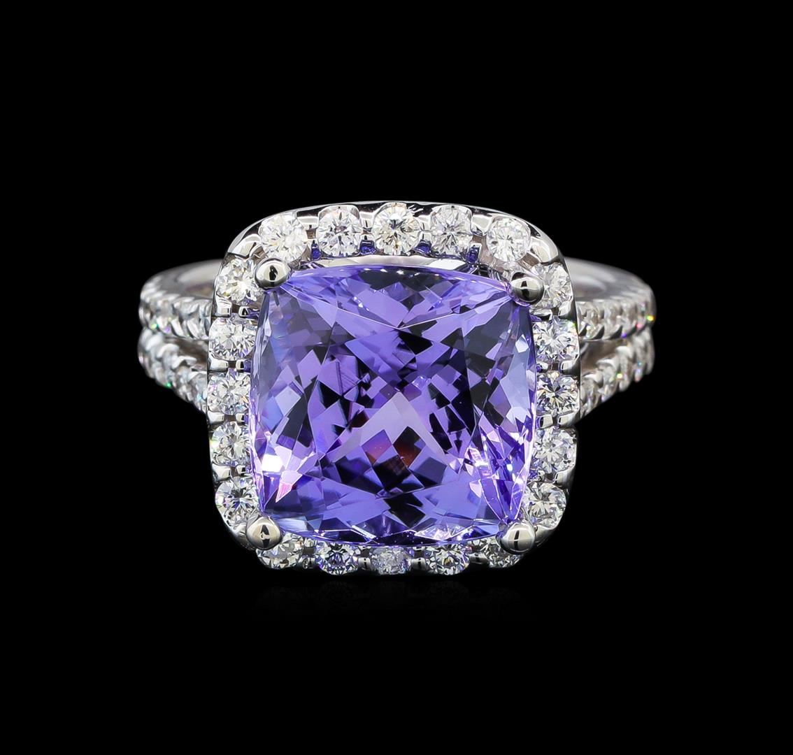 One electronically tested 14KT white gold ladies cast tanzanite and diamond ring with a bright polish finish. Identified with markings of "K14". Condition is new. Containing: One prong set square cushion modified brilliant cut natural tanzanite, measuring 11.00 x 11.00 x 7.15mm, approximate weight of 6.81ct., clarity is eye clean, type I, medium light, moderately strong, violet color, (GIA V 4/4), cut is good. Sixty prong set round brilliant cut diamonds, measuring 1.30 - 1.30 x 0.78mm (depth est.) approximate. Total Weight of 60 Stones = 0.48ct. Clarity: SI-1 to SI-2. Color: I - J, Cut is Good. Colored gemstones are presumed to have been subjected to commonly used enhancement processes. All diamonds and colored gemstones are graded in the mounting, unless otherwise stated. Total Weight of Colored Stones 6.81ct. Total Weight of Diamonds 0.48ct. Total Weight of Ring 8.00 grams. GGL Appraised.