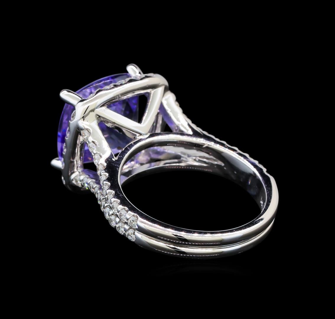 One electronically tested 14KT white gold ladies cast tanzanite and diamond ring with a bright polish finish. Identified with markings of "K14". Condition is new. Containing: One prong set square cushion modified brilliant cut natural tanzanite, measuring 11.00 x 11.00 x 7.15mm, approximate weight of 6.81ct., clarity is eye clean, type I, medium light, moderately strong, violet color, (GIA V 4/4), cut is good. Sixty prong set round brilliant cut diamonds, measuring 1.30 - 1.30 x 0.78mm (depth est.) approximate. Total Weight of 60 Stones = 0.48ct. Clarity: SI-1 to SI-2. Color: I - J, Cut is Good. Colored gemstones are presumed to have been subjected to commonly used enhancement processes. All diamonds and colored gemstones are graded in the mounting, unless otherwise stated. Total Weight of Colored Stones 6.81ct. Total Weight of Diamonds 0.48ct. Total Weight of Ring 8.00 grams. GGL Appraised.