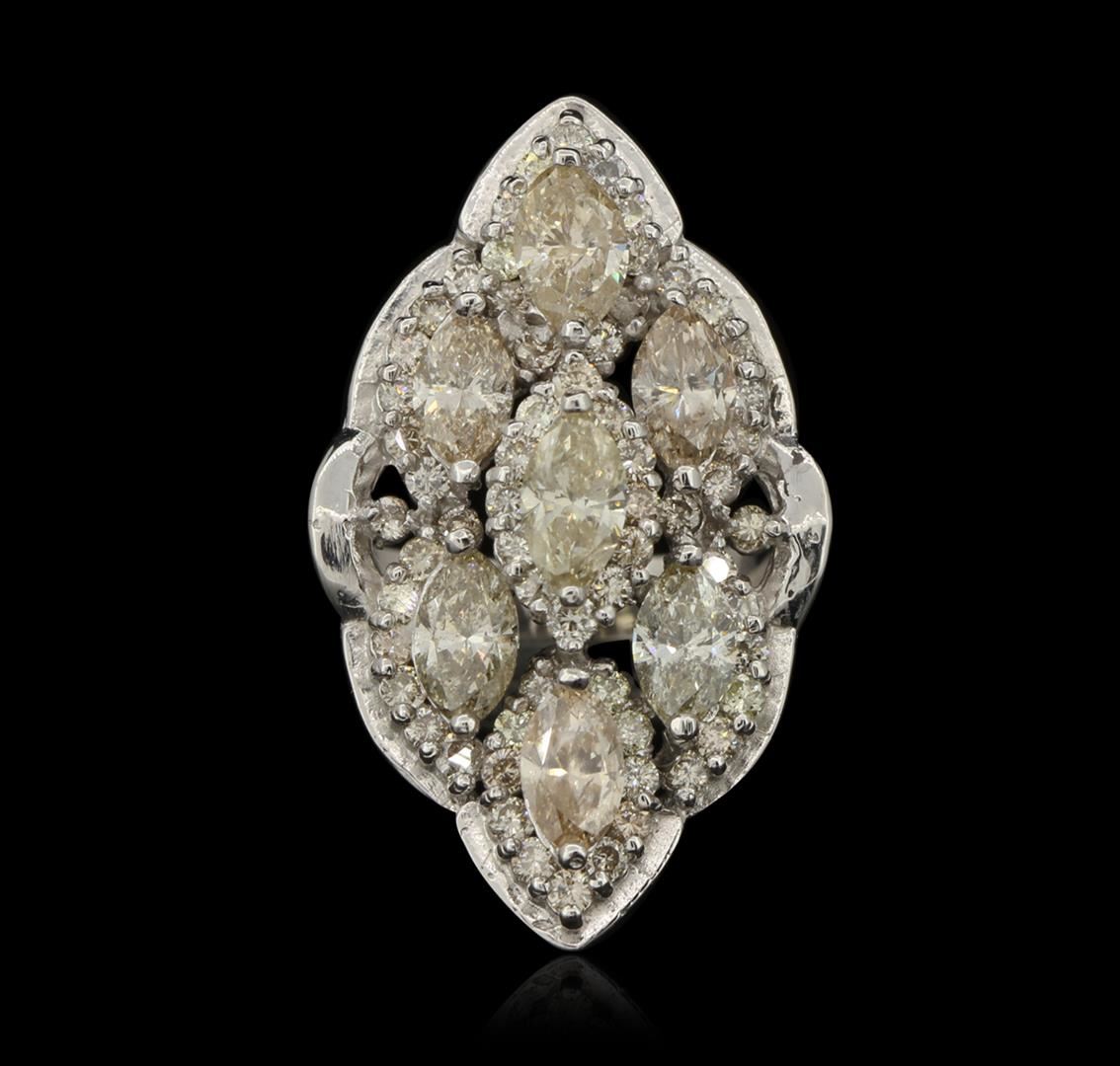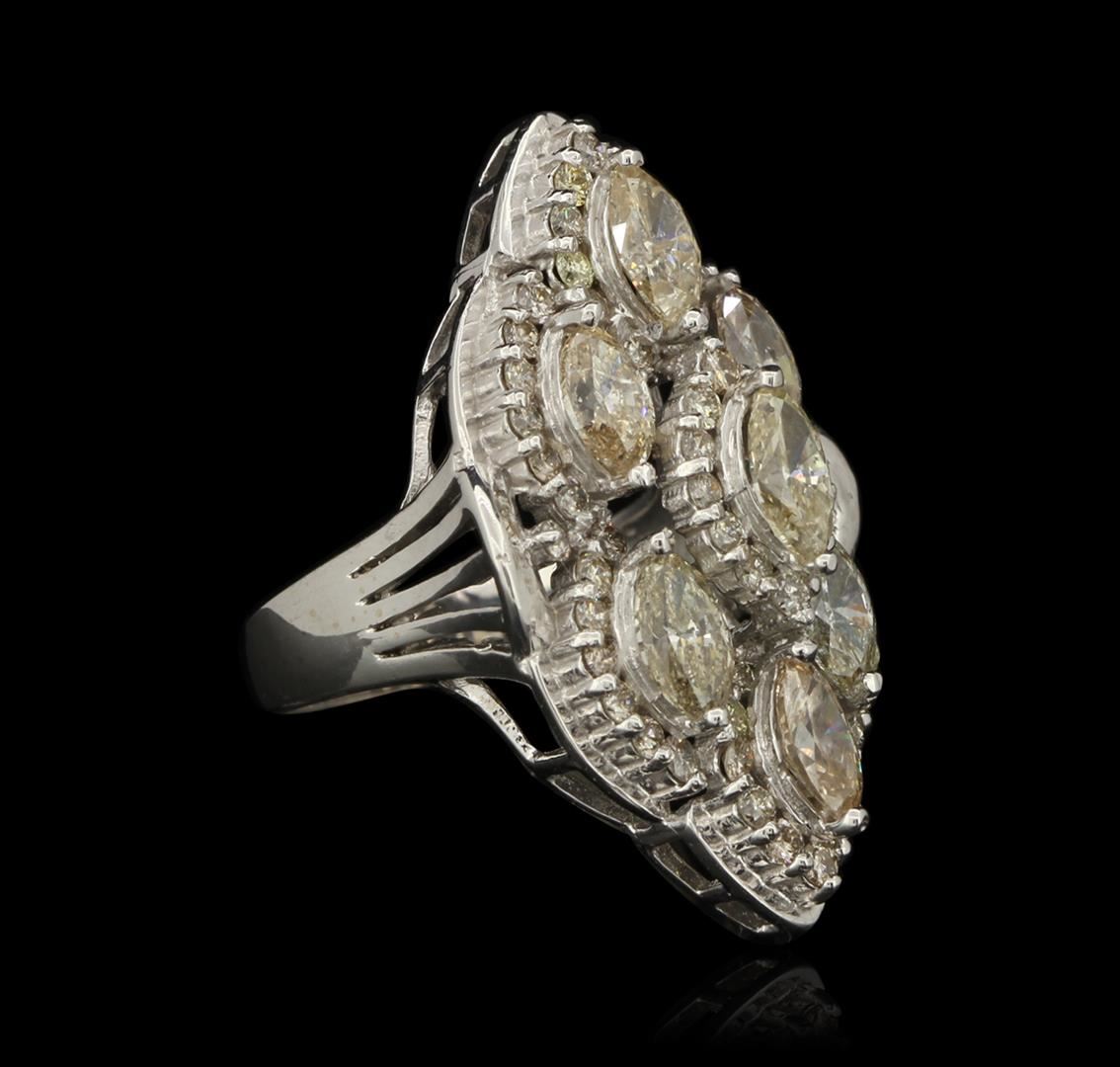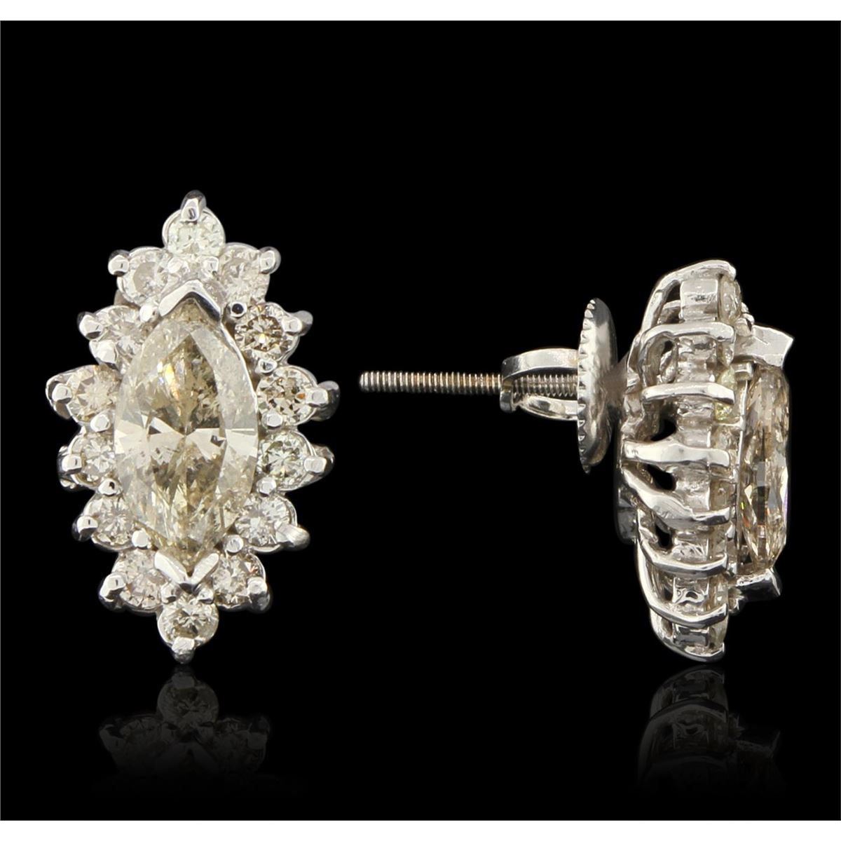 New Condition! One suite electronically tested 14KT white gold Ladies combination cast & assembled fashion ring and earrings with screw backs with a bright polish finish. Identified with markings of "14K". Condition is excellent. Containing: Eighty-Five prong set round brilliant cut diamonds, measuring 1.50 - 1.50 x 0.90mm (depth est.) approximate total weight of 85 Stones = 1.04ct. Clarity of SI-1 to I-1, Color of J - N. Nine prong set marquise shaped cut diamonds, measuring 8.57 x 4.52 x 2.89mm (depth est.) approximate total weight of 9 Stones = 5.78ct. Clarity of I-1 to I-1, Color of N - P. Total Weight of Diamonds 6.82 ct. Total Weight of Ring 13.50 gm. GGL Appraised at $33,125.00.