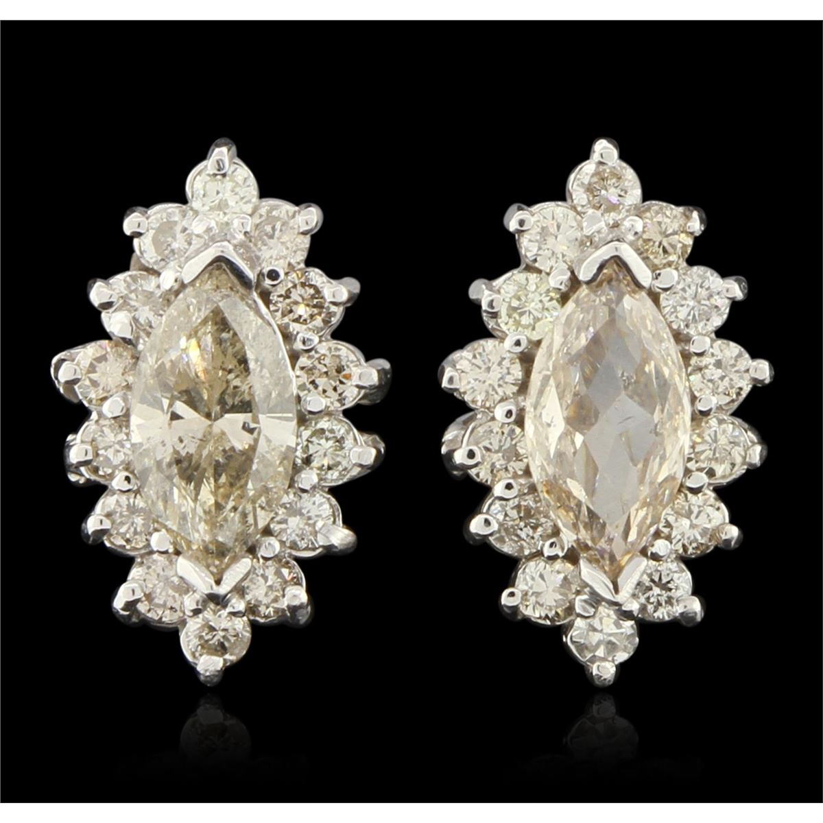 New Condition! One suite electronically tested 14KT white gold Ladies combination cast & assembled fashion ring and earrings with screw backs with a bright polish finish. Identified with markings of "14K". Condition is excellent. Containing: Eighty-Five prong set round brilliant cut diamonds, measuring 1.50 - 1.50 x 0.90mm (depth est.) approximate total weight of 85 Stones = 1.04ct. Clarity of SI-1 to I-1, Color of J - N. Nine prong set marquise shaped cut diamonds, measuring 8.57 x 4.52 x 2.89mm (depth est.) approximate total weight of 9 Stones = 5.78ct. Clarity of I-1 to I-1, Color of N - P. Total Weight of Diamonds 6.82 ct. Total Weight of Ring 13.50 gm. GGL Appraised at $33,125.00.