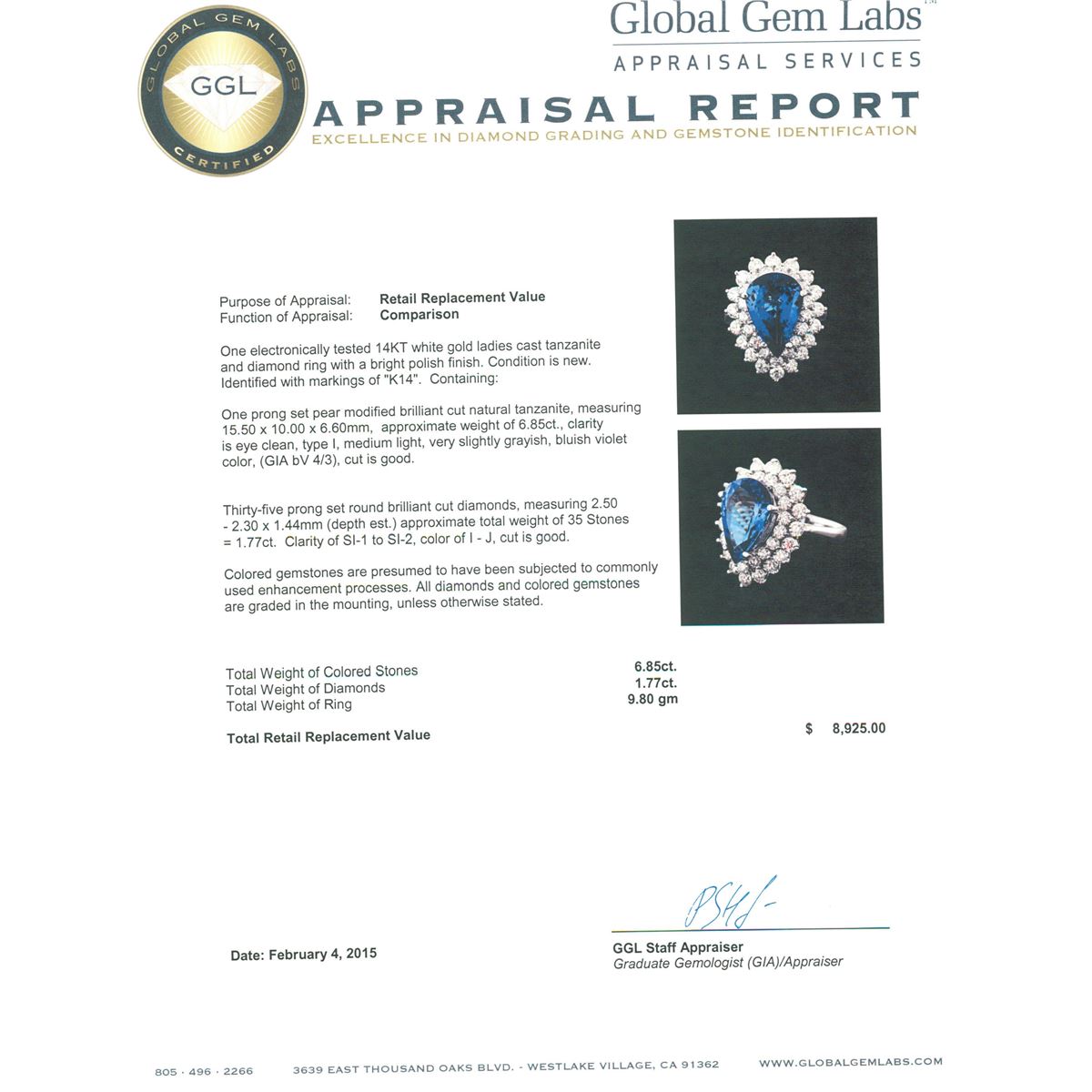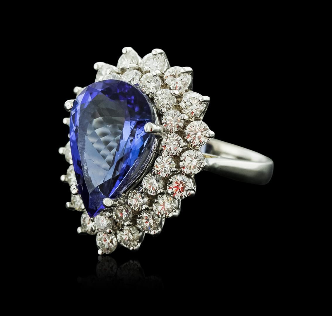One electronically tested 14KT white gold ladies cast tanzanite and diamond ring with a bright polish finish. Identified with markings of "K14". Condition is new. Containing: One prong set pear modified brilliant cut natural tanzanite, measuring 15.50 x 10.00 x 6.60mm, approximate weight of 6.85ct., clarity is eye clean, type I, medium light, very slightly grayish, bluish violet color, (GIA bV 4/3), cut is good. Thirty-Five prong set round brilliant cut diamonds, measuring 2.50 - 2.30 x 1.44mm (depth est.) approximate total weight of 35 Stones = 1.77ct. Clarity: SI-1 to SI-2. Color: I - J, Cut is Good. Colored gemstones are presumed to have been subjected to commonly used enhancement processes. All diamonds and colored gemstones are graded in the mounting, unless otherwise stated. Total Weight of Colored Stones 6.85ct. Total Weight of Diamonds 1.77ct. Total Weight of Ring 9.80 grams. GGL Appraised at $8,925.00.