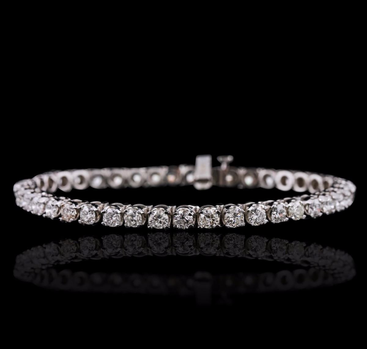 One electronically tested 14KT white gold ladies cast & assembled diamond tennis bracelet with a bright polish finish. Condition is new, good workmanship. Seven inch length bracelet composed of a flexible ribbon of diamonds, terminating in a concealed clasp with safety bar. Identified with markings of "14K". Tennis bracelets & necklaces got their unusual name from an incident involving the U.S. professional tennis player Chris Evert during a tennis match in the 1980's. Evert had been wearing an expensive diamond bracelet, an inline string of individually-set diamonds. Previously these bracelets were known as eternity bracelets. When the clasp snapped during play, she asked the officials to stop the tennis match until the bracelet could be found. Since that day, bracelets and necklaces featuring an inline string of diamonds have been called tennis bracelets and tennis necklaces. Containing: Forty-One prong set round brilliant cut diamonds, measuring 3.60 - 3.50 x 2.13mm (depth est.) approximate total weight of 41 Stones = 6.85ct. Graded in the setting. Clarity: I-1 to I-2. Color: G - J. Total Weight of Diamonds 6.85ct. Total Weight of Tennis Bracelet 14.30 grams. AIG Appraised at $17,785.00.
