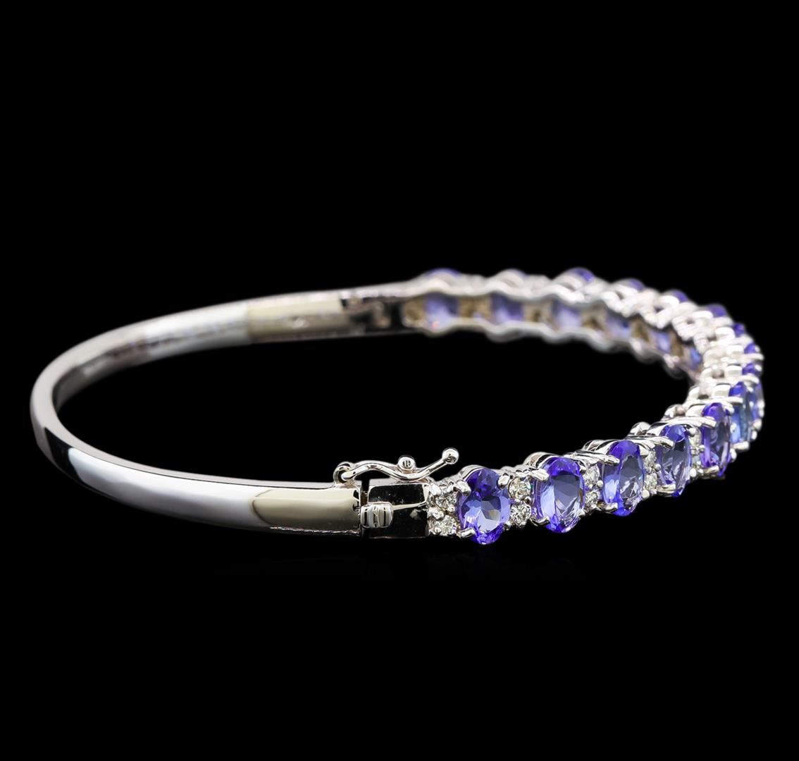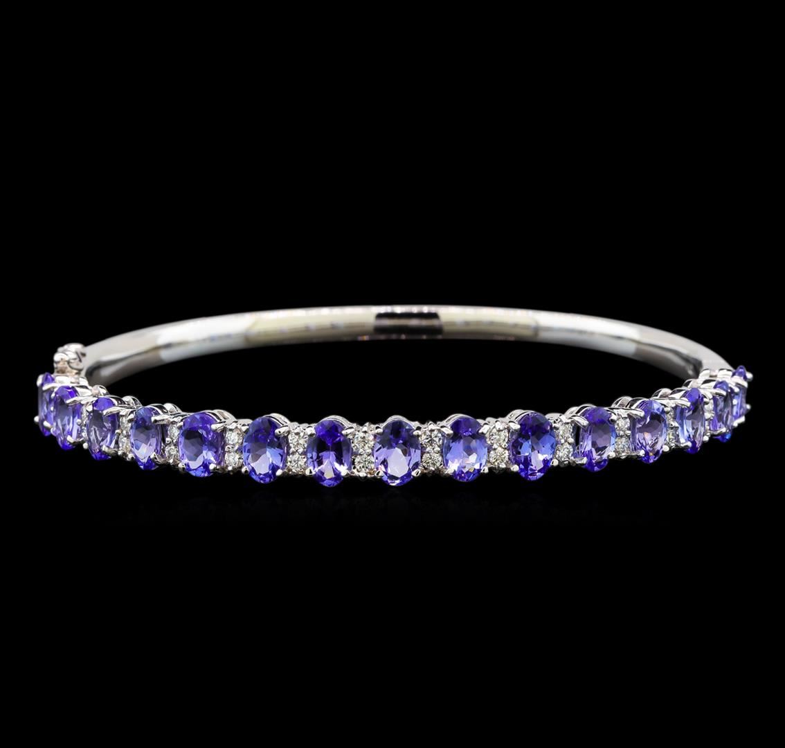 One electronically tested 14KT white gold ladies cast tanzanite and diamond bangle bracelet with a hidden box clasp with safety closer with a bright polish finish. Identified with markings of "14K". Condition is new. Containing: Fifteen prong set oval modified brilliant cut natural tanzanites, measuring 6.00. x 4.50 x 2.93mm, approximate total weight of 6.88ct., clarity is eye clean, type I, medium light, very slightly grayish, violet color, (GIA V 4/3), cut is good. Thirty-Two prong set round brilliant cut diamonds, measuring 1.80 - 1.80 x 1.08mm (depth est.) approximate total weight of 32 Stones = 0.74ct. Clarity: SI-1. Color: I - J, Cut is Good. Colored gemstones are presumed to have been subjected to commonly used enhancement processes. All diamonds and colored gemstones are graded in the mounting, unless otherwise stated. Total Weight of Colored Stones 6.88ct. Total Weight of Diamonds 0.74ct. Total Weight of Bangle Bracelet 19.10 grams. GGL Appraised at $6,360.00.
