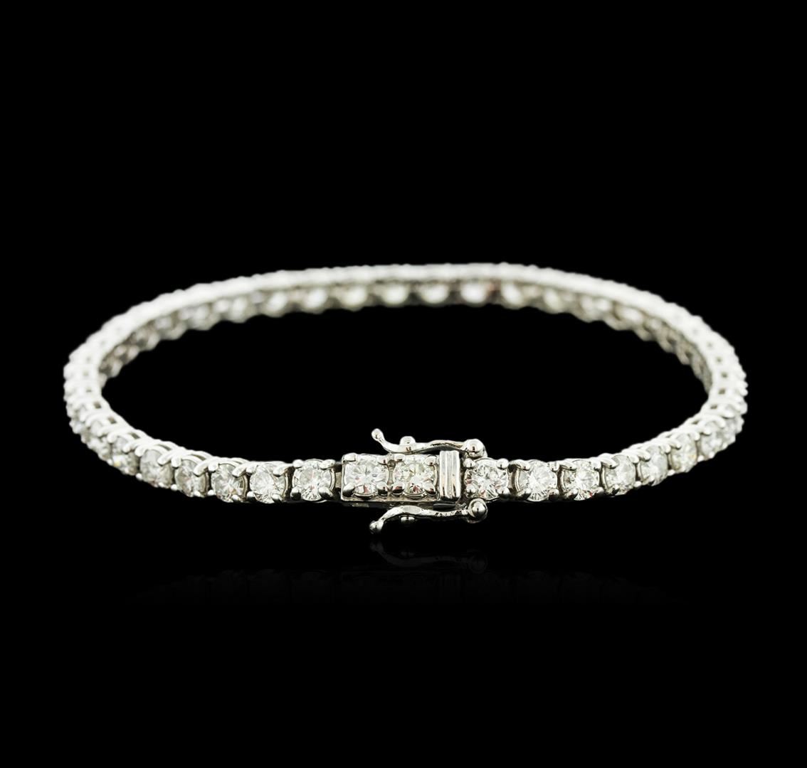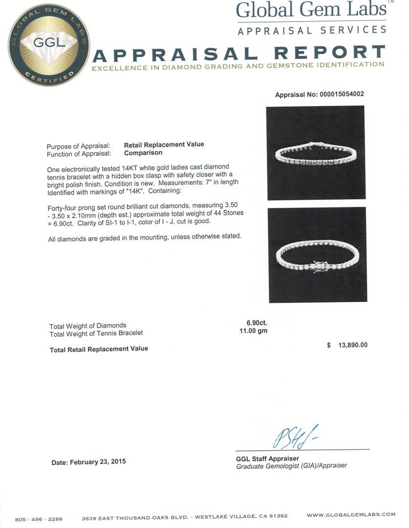 One electronically tested 14KT white gold ladies cast diamond tennis bracelet with a hidden box clasp with safety closer with a bright polish finish. Measurements: 7" in length Identified with markings of "14K". Condition is new. Containing: Forty-Four prong set round brilliant cut diamonds, measuring 3.50 - 3.50 x 2.10mm (depth est.) approximate total weight of 44 Stones = 6.90ct. Clarity: SI-1 to I-1. Color: I - J, Cut is Good. All diamonds are graded in the mounting, unless otherwise stated. Total Weight of Diamonds 6.90ct. Total Weight of Tennis Bracelet 11.00 grams. GGL Appraised at $13,890.00.