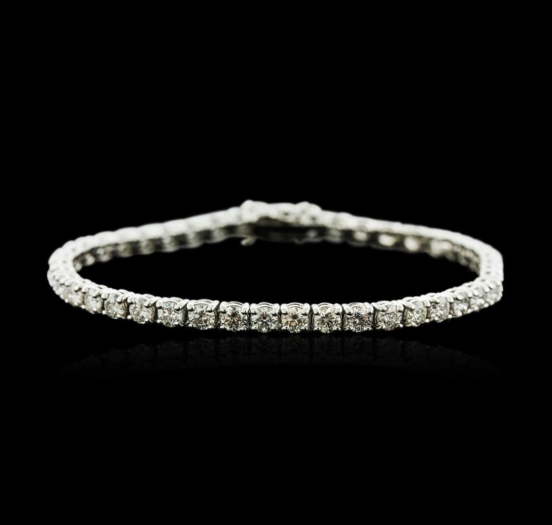 One electronically tested 14KT white gold ladies cast diamond tennis bracelet with a hidden box clasp with safety closer with a bright polish finish. Measurements: 7" in length Identified with markings of "14K". Condition is new. Containing: Forty-Four prong set round brilliant cut diamonds, measuring 3.50 - 3.50 x 2.10mm (depth est.) approximate total weight of 44 Stones = 6.90ct. Clarity: SI-1 to I-1. Color: I - J, Cut is Good. All diamonds are graded in the mounting, unless otherwise stated. Total Weight of Diamonds 6.90ct. Total Weight of Tennis Bracelet 11.00 grams. GGL Appraised at $13,890.00.