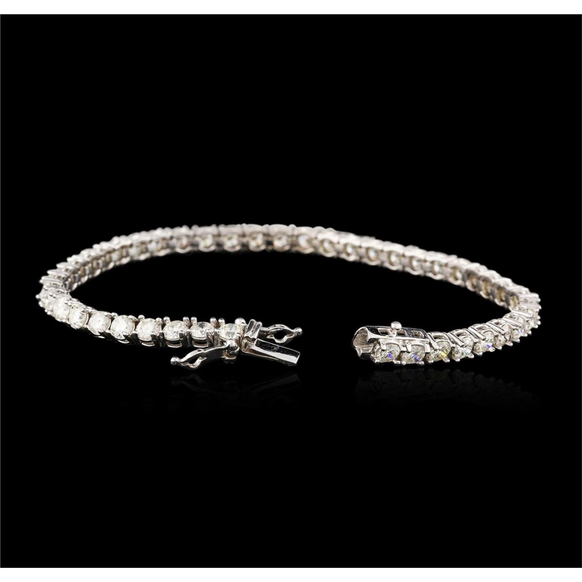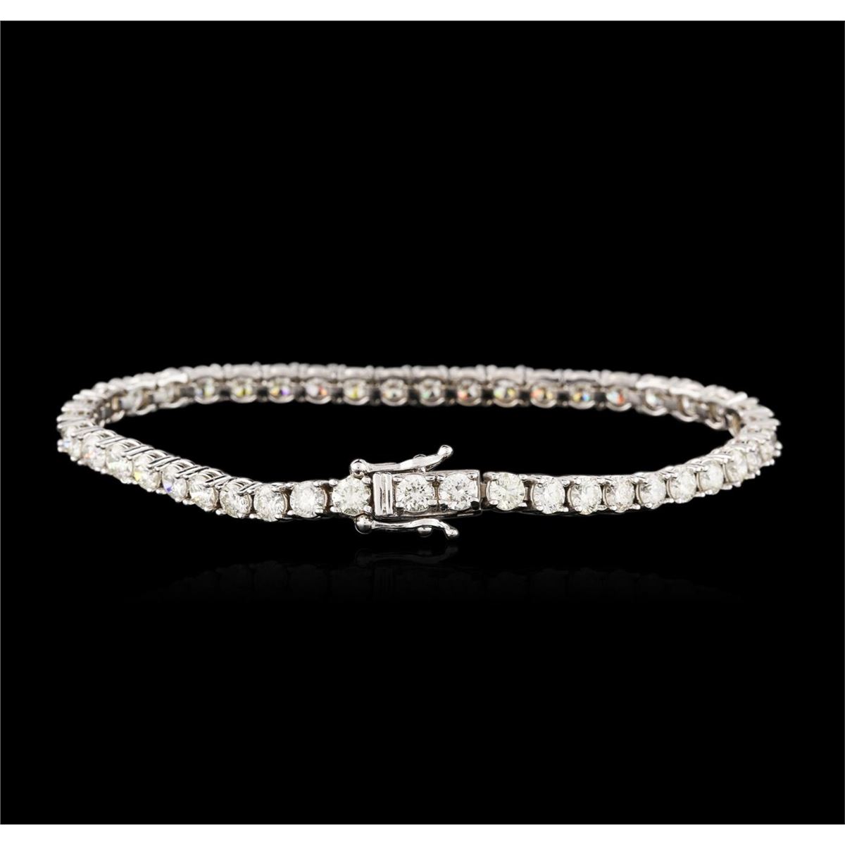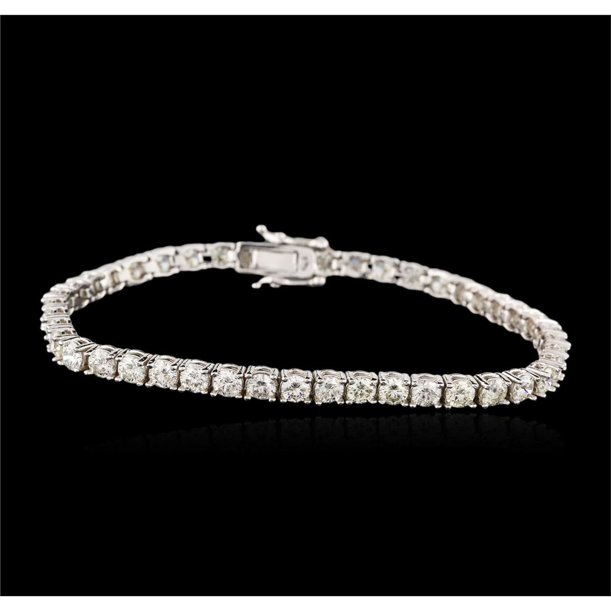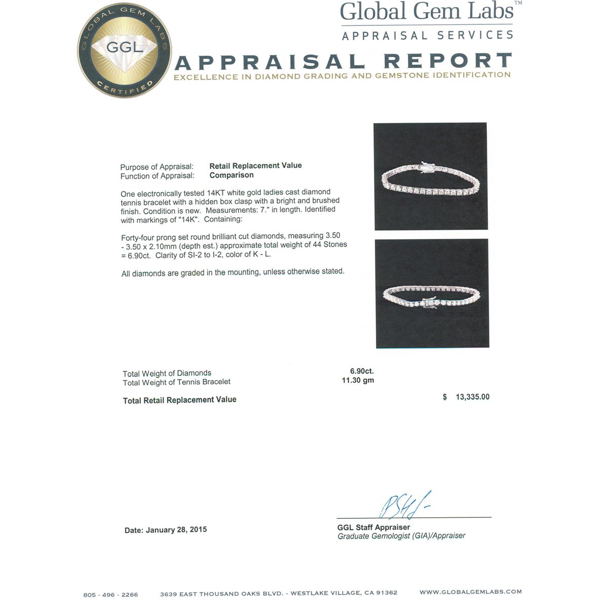 One electronically tested 14KT white gold ladies cast diamond tennis bracelet with a hidden box clasp with a bright and brushed finish. Measurements: 7." in length. Identified with markings of "14K". Condition is new. Containing: Forty-Four prong set round brilliant cut diamonds, measuring 3.50 - 3.50 x 2.10mm (depth est.) approximate total weight of 44 Stones = 6.90ct. Clarity: SI-2 to I-2. Color: K - L. All diamonds are graded in the mounting, unless otherwise stated. Total Weight of Diamonds 6.90ct. Total Weight of Tennis Bracelet 11.30 grams. GGL Appraised at $13,335.00.