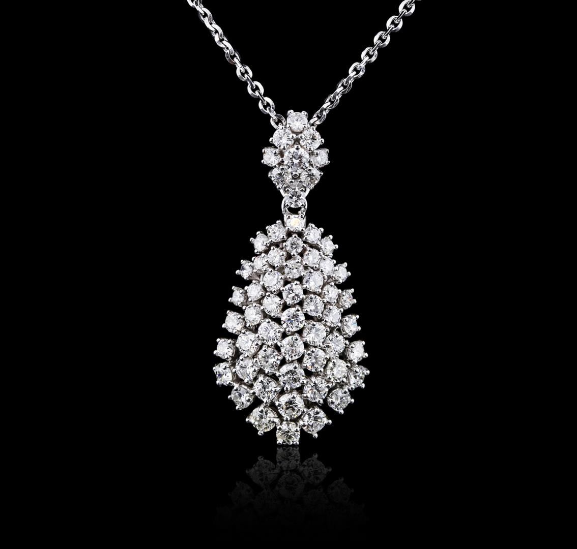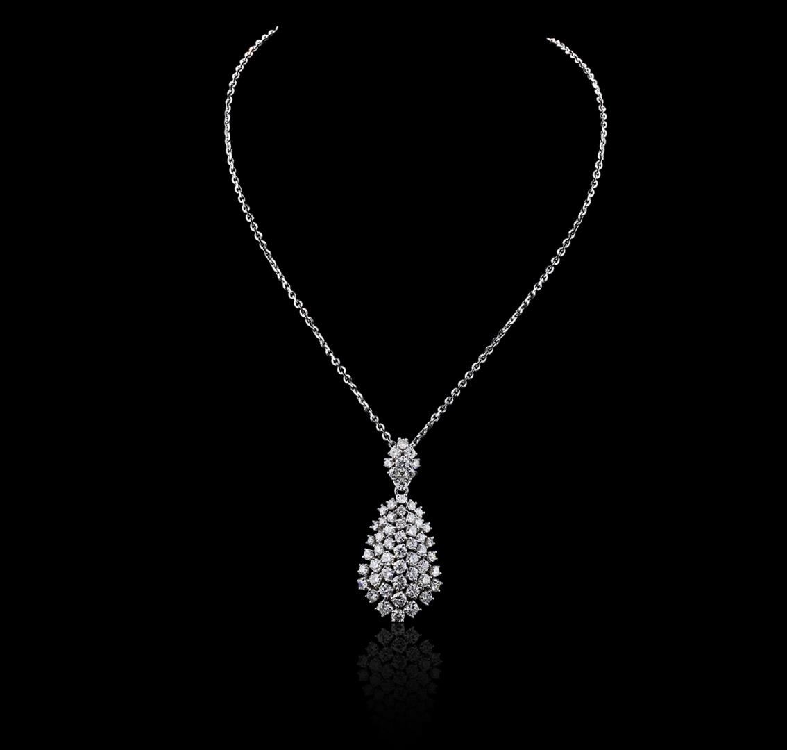 One electronically tested 14KT white gold ladies cast & assembled diamond pendant with chain. Condition is new, good workmanship. The pendant features a bouquet of diamonds completed by a diamond set bail. The pendant is supported by a twenty inch length 14KT white gold designer style chain terminating in a lobster claw clasp. Bright polish finish. Identified with markings of "14K". Containing: Fifty-seven prong set round brilliant cut diamonds, measuring 3.70 - 2.50 x 1.86mm (depth est.) approximate total weight of 57 Stones = 6.92ct. Graded in the setting. Clarity SI-2 to I-1. Color F -- H. Total Weight of Diamonds 6.92ct. Total Weight of Pendant With Chain 18.70gm. AIG Appraised at $26,015.00.
