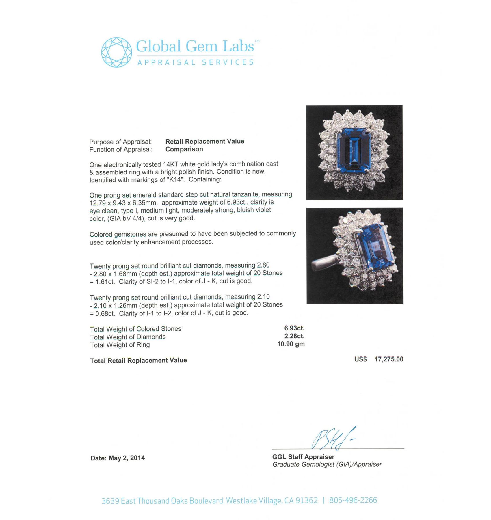 One electronically tested 14KT white gold Ladies combination cast & assembled ring with a bright polish finish. Condition is new. Identified with markings of "K14". Containing: One prong set emerald standard step cut natural tanzanite, measuring 12.79 x 9.43 x 6.35mm, approximate weight of 6.93ct., clarity is eye clean, type I, medium light, moderately strong, bluish violet color, (GIA bV 4/4), cut is very good. Colored gemstones are presumed to have been subjected to commonly used color/clarity enhancement processes. Twenty prong set round brilliant cut diamonds, measuring 2.80 - 2.80 x 1.68mm (depth est.) approximate. Total Weight of 20 Stones = 1.61ct. Clarity: SI-2 to I-1. Color: J - K, Cut is Good. Twenty prong set round brilliant cut diamonds, measuring 2.10 - 2.10 x 1.26mm (depth est.) approximate. Total Weight of 20 Stones = 0.68ct. Clarity: I-1 to I-2. Color: J - K, Cut is Good. Total Weight of Colored Stones 6.93ct. Total Weight of Diamonds 2.28ct. Total Weight of Ring 10.90 grams. GGL Appraised at $17,275.00.