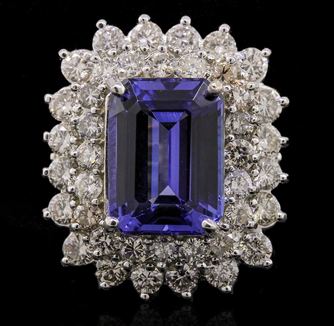 One electronically tested 14KT white gold Ladies combination cast & assembled ring with a bright polish finish. Condition is new. Identified with markings of "K14". Containing: One prong set emerald standard step cut natural tanzanite, measuring 12.79 x 9.43 x 6.35mm, approximate weight of 6.93ct., clarity is eye clean, type I, medium light, moderately strong, bluish violet color, (GIA bV 4/4), cut is very good. Colored gemstones are presumed to have been subjected to commonly used color/clarity enhancement processes. Twenty prong set round brilliant cut diamonds, measuring 2.80 - 2.80 x 1.68mm (depth est.) approximate. Total Weight of 20 Stones = 1.61ct. Clarity: SI-2 to I-1. Color: J - K, Cut is Good. Twenty prong set round brilliant cut diamonds, measuring 2.10 - 2.10 x 1.26mm (depth est.) approximate. Total Weight of 20 Stones = 0.68ct. Clarity: I-1 to I-2. Color: J - K, Cut is Good. Total Weight of Colored Stones 6.93ct. Total Weight of Diamonds 2.28ct. Total Weight of Ring 10.90 grams. GGL Appraised at $17,275.00.