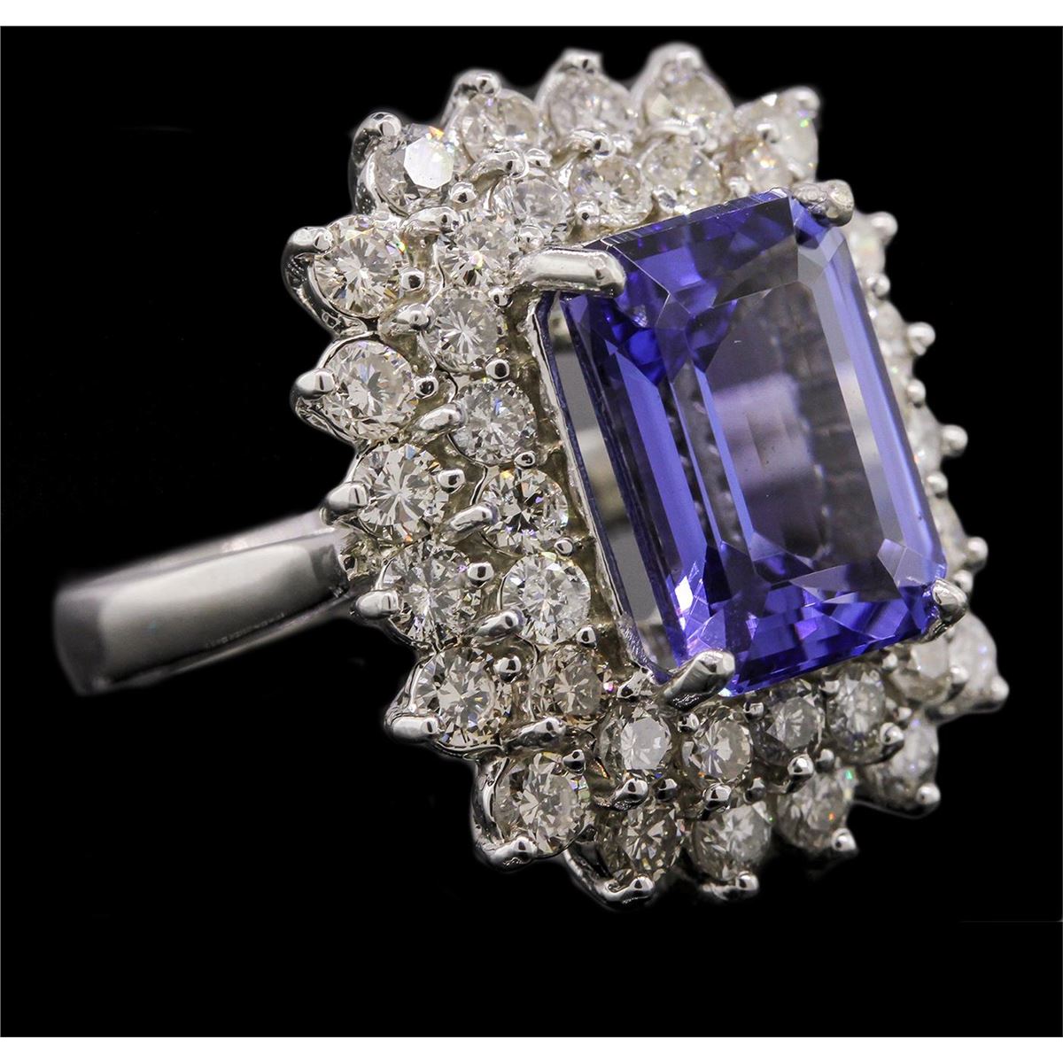 One electronically tested 14KT white gold Ladies combination cast & assembled ring with a bright polish finish. Condition is new. Identified with markings of "K14". Containing: One prong set emerald standard step cut natural tanzanite, measuring 12.79 x 9.43 x 6.35mm, approximate weight of 6.93ct., clarity is eye clean, type I, medium light, moderately strong, bluish violet color, (GIA bV 4/4), cut is very good. Colored gemstones are presumed to have been subjected to commonly used color/clarity enhancement processes. Twenty prong set round brilliant cut diamonds, measuring 2.80 - 2.80 x 1.68mm (depth est.) approximate. Total Weight of 20 Stones = 1.61ct. Clarity: SI-2 to I-1. Color: J - K, Cut is Good. Twenty prong set round brilliant cut diamonds, measuring 2.10 - 2.10 x 1.26mm (depth est.) approximate. Total Weight of 20 Stones = 0.68ct. Clarity: I-1 to I-2. Color: J - K, Cut is Good. Total Weight of Colored Stones 6.93ct. Total Weight of Diamonds 2.28ct. Total Weight of Ring 10.90 grams. GGL Appraised at $17,275.00.